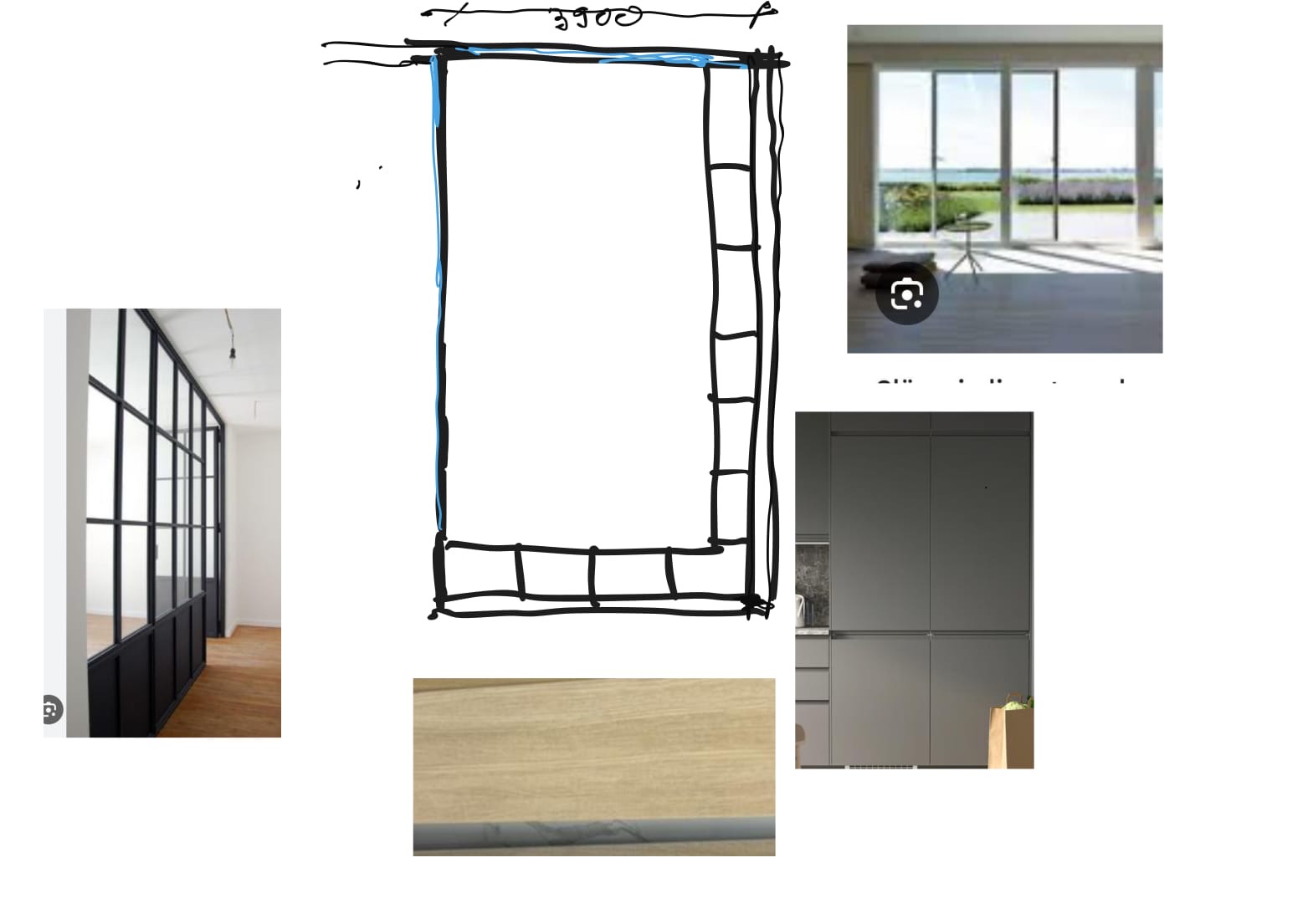 on the left side of the drawing glass front with door kitchen to be matte gray floor tiles with a wood pattern window side on the north of floorplan from top to floor