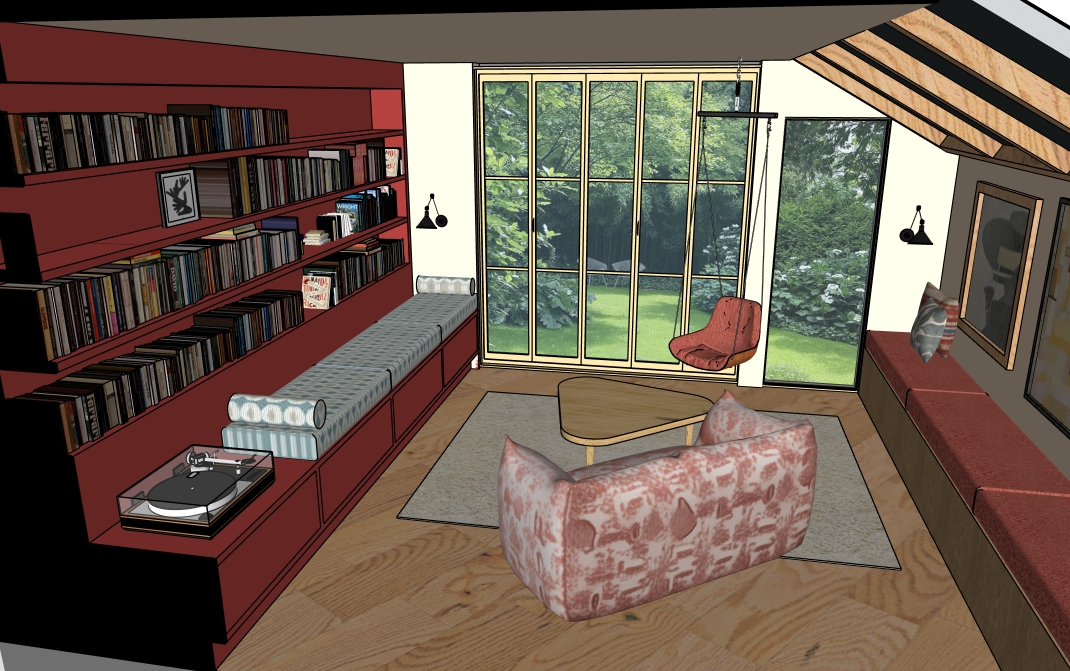 1 joinery on the left is semi glossy brick red coulour 2 add sky light between the beams on the top right