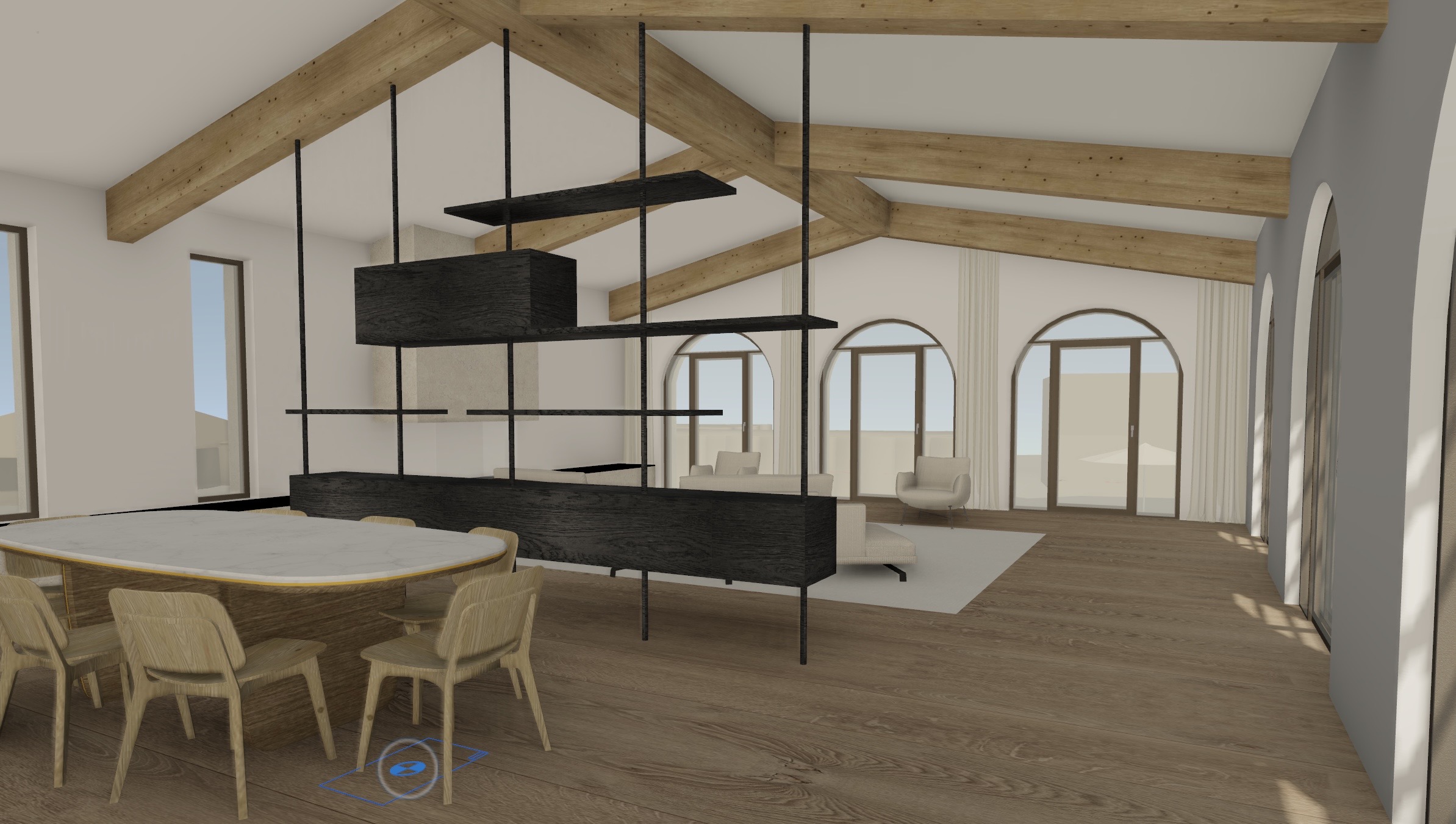 a modern luxurious kitchen with a serene and sophisticated atmosphere the room features sleek grey oak cabinetry with flutted travertine curved cabinets and a large island centerpiece made natural traavertine romano the walls are clad in a soft cashmere hue with panelling complementing the cabinetry appliances are seamlessly integrated adding a touch of contrast overhead lighting is warm and ambient creating a cozy yet refined ambiance the flooring is parquet enhancing the airy feel of the space sparse greenery adds a hint of freshness while maintaining the minimalistic and clean design outdoor light from the right hand side window view is of luxury villa style