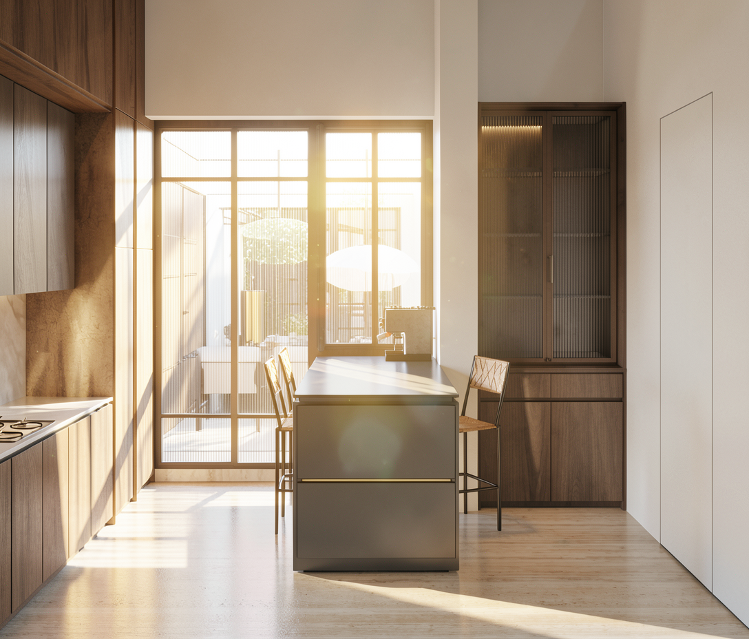 international style interior shot photorealistic interior visualization of the room exactly as in the reference image keep all furniture layout proportions materials and colors unchanged show everything clearly with realistic textures on wood fabric metal and glass surfaces soft warm and atmospheric lighting that enhances depth shadows and reflections creating a cozy and inviting mood accurate natural light and subtle ambient glow high end interior design look realistic shadows and highlights clean and calm environment visually rich and immersive do not alter the perspective camera angle or any elements in the scene architecture
