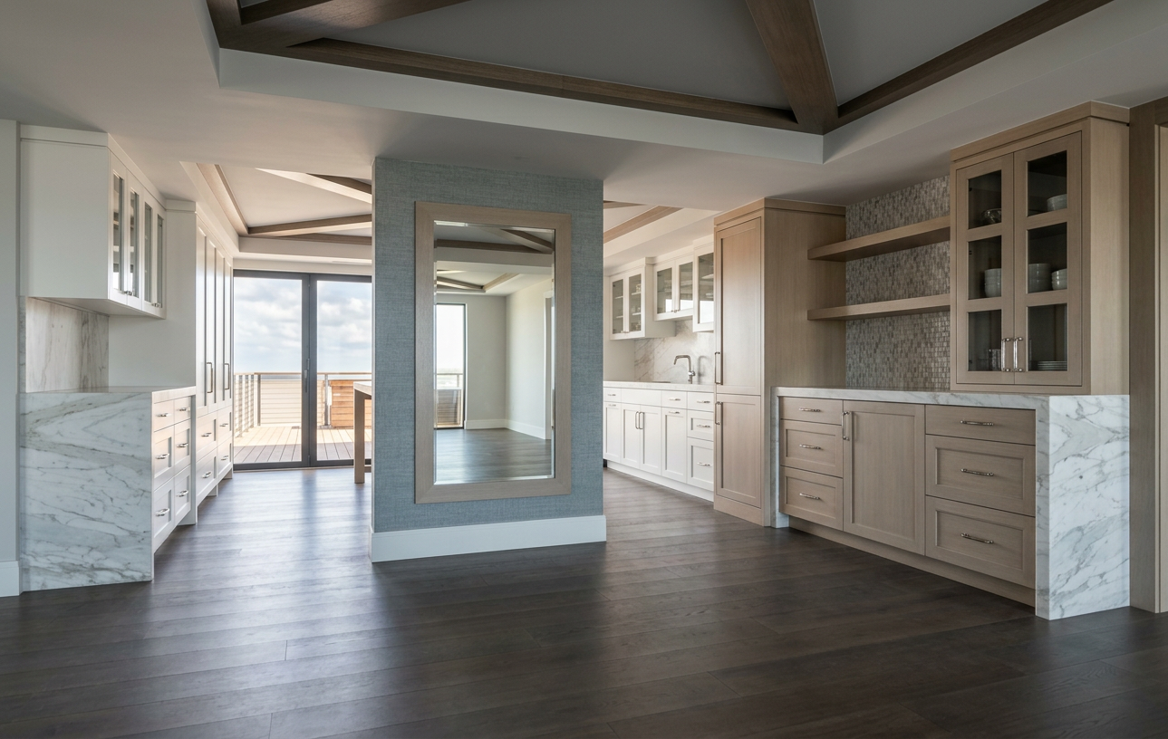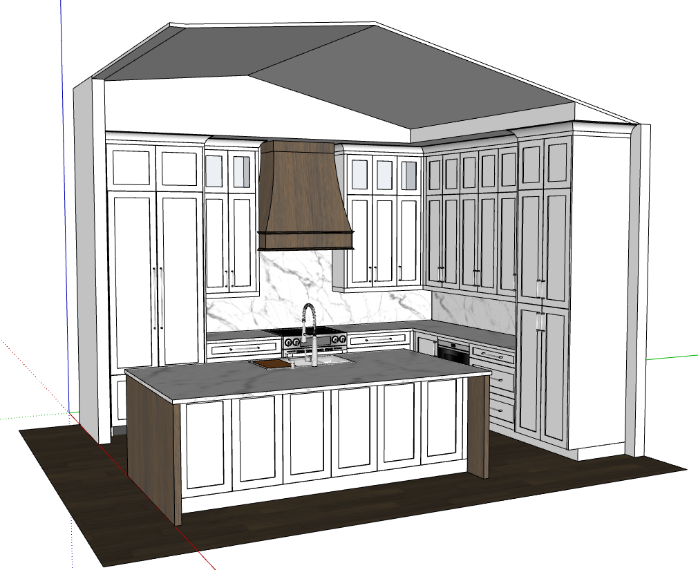 photorealistic rendering of the kitchen keep geometry textures and colors the same as input image keep moldings on top of the hood and cabinets the same as input image glass doors in stacked cabinets on left and right of hood