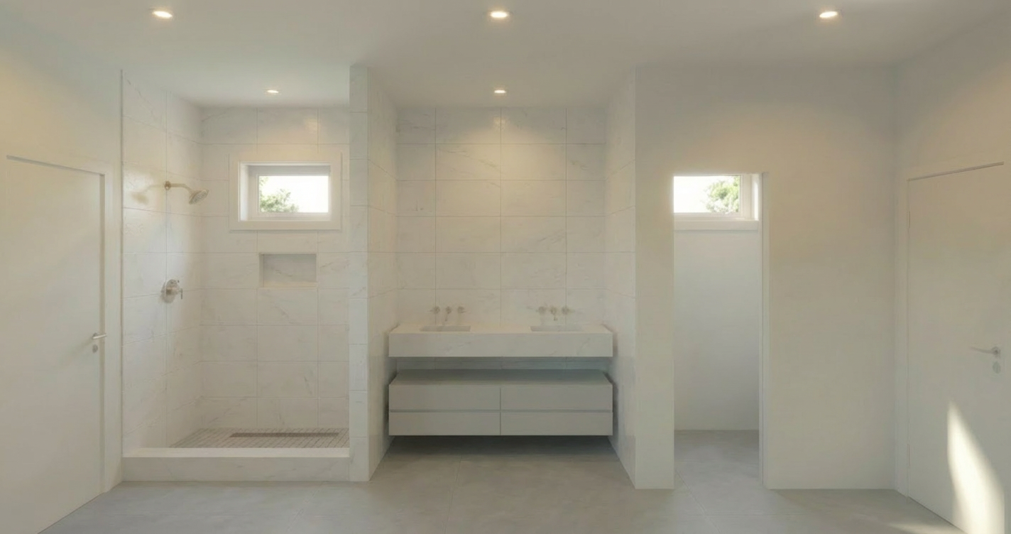 keep everything exactly the same in the rendering do not change the layout walls doors vanity fixtures shower tile windows ceiling or floor only add a 4 tile base molding all around the room in the same gray tile floor do not change anything else in the room