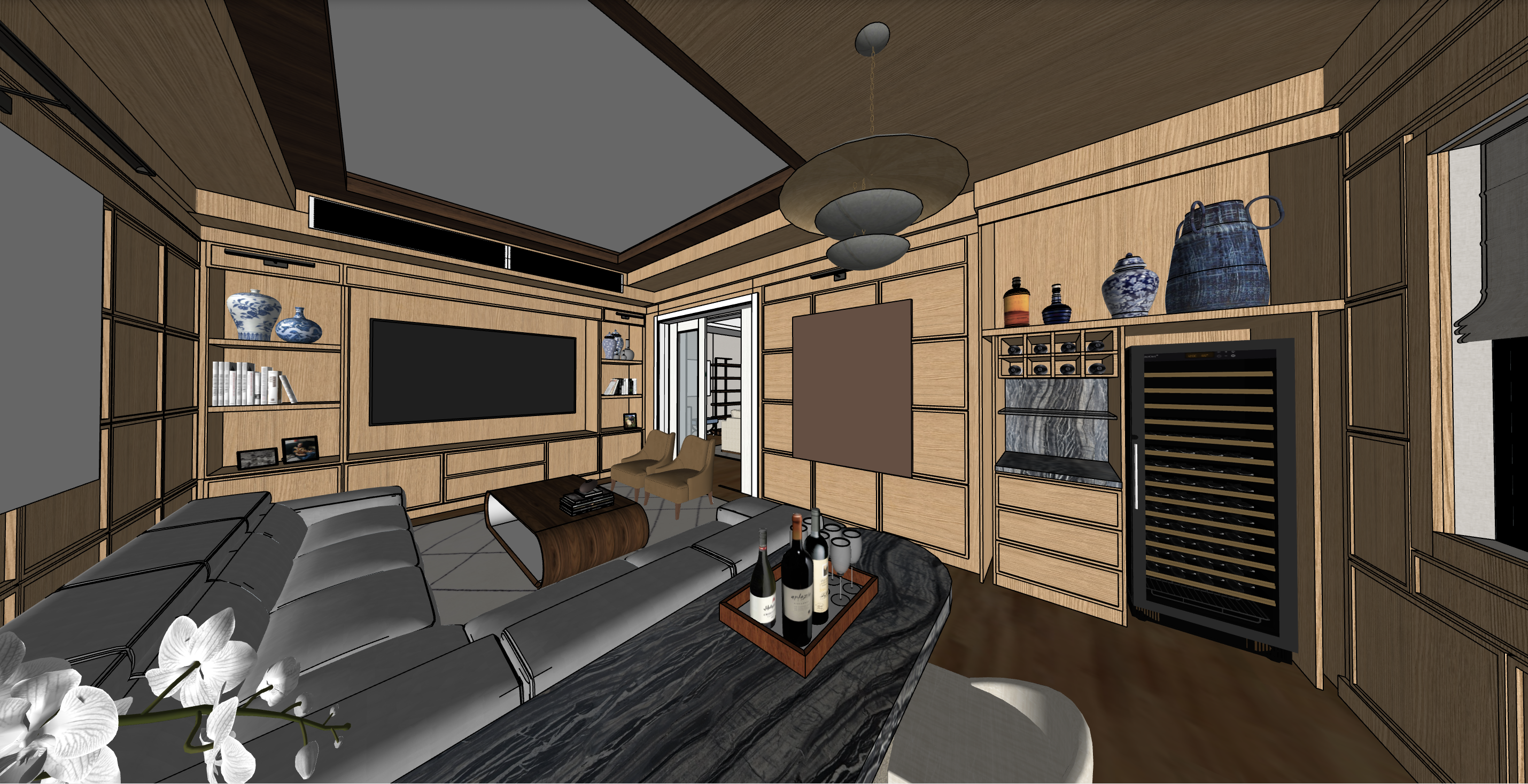 make wall panels white oak sofa grey light leather very shiny the pendant light is dark bronze and the door is white