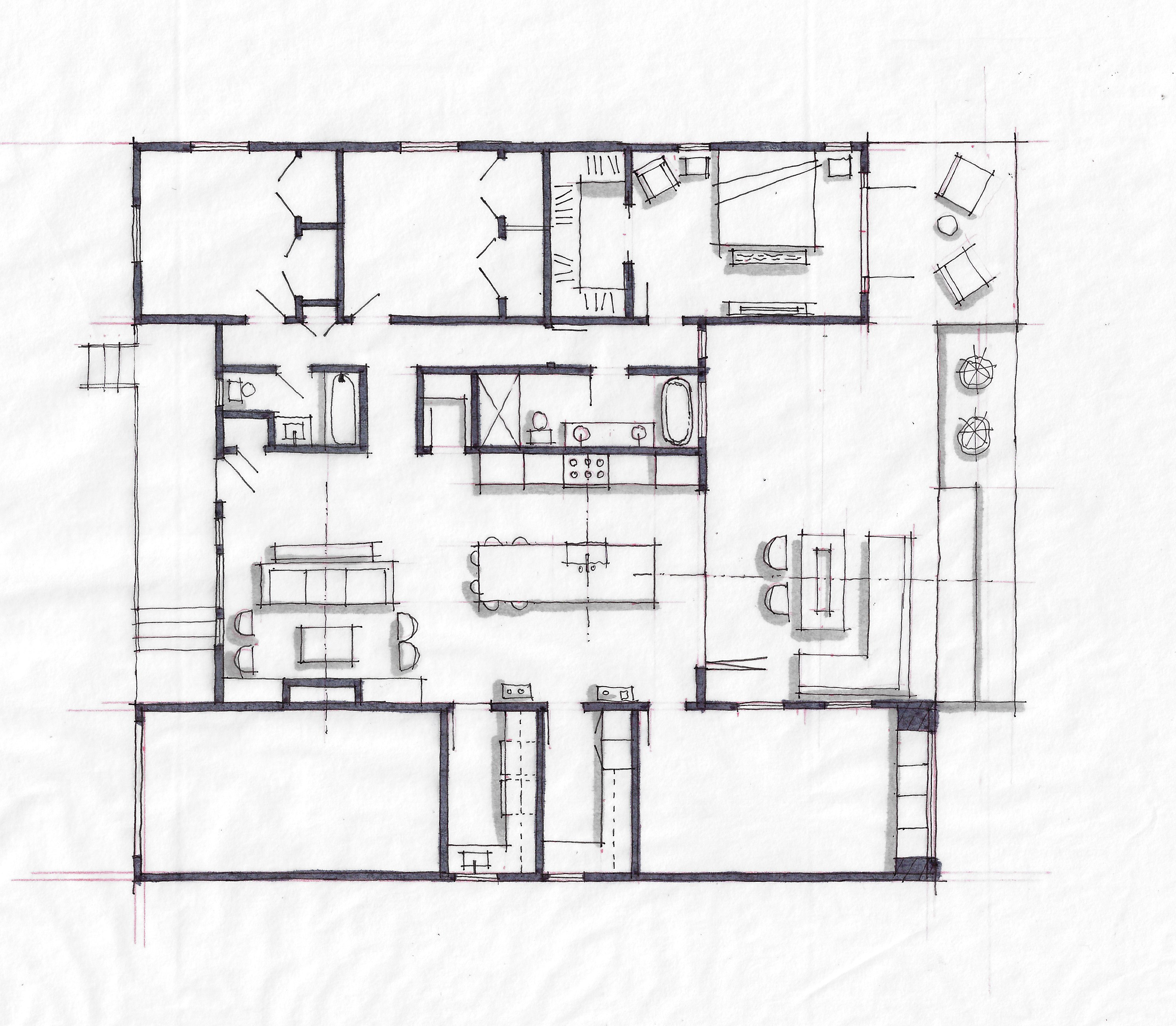 exterior shot create a 3d render of the sketched floor plan to be traditional farmhouse style showing only walls and no roof can it be a birds eye view