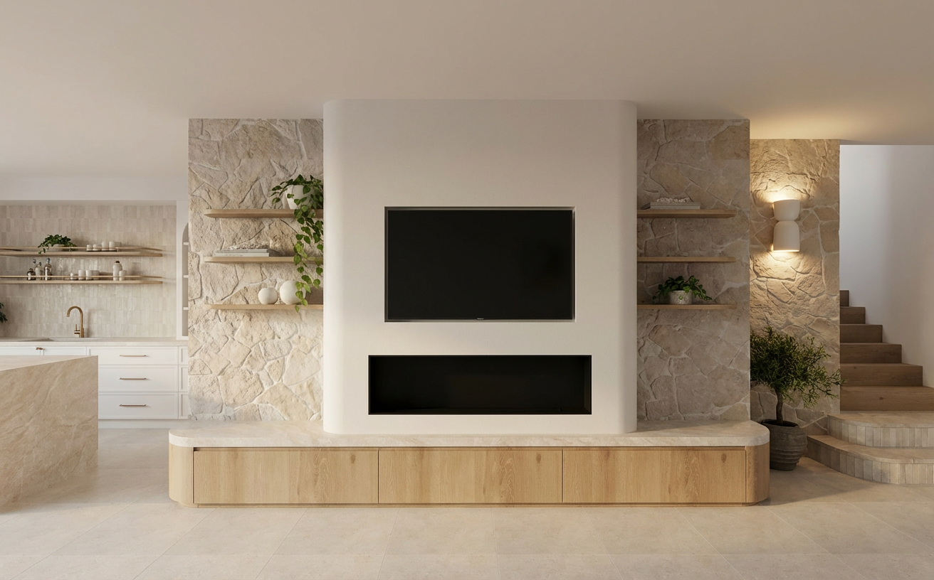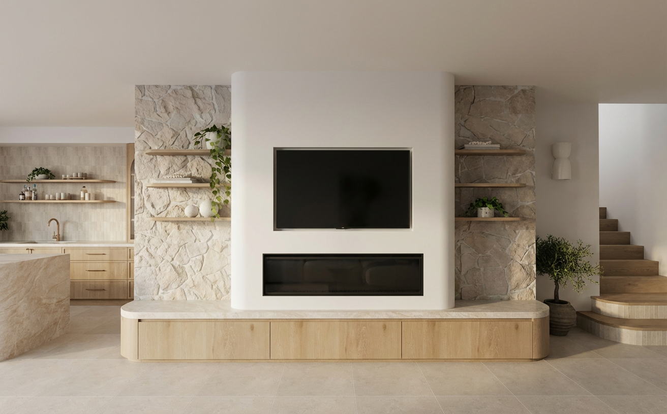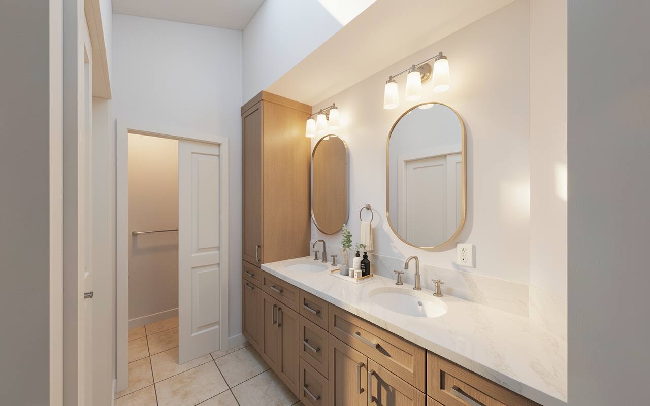 preserve the exact layout camera angle and placement of all elements do not move or redesign anything enhance the bathroom with realistic finishes light wood flooring full height tiled shower tub walls to the ceiling warm wooden vanities light colored quartz countertops subtle greige colored walls brushed nickel plumbing fixtures large mirriors over the sinks that are the same length as the vanity and reach half way up the wall add soft warm lighting