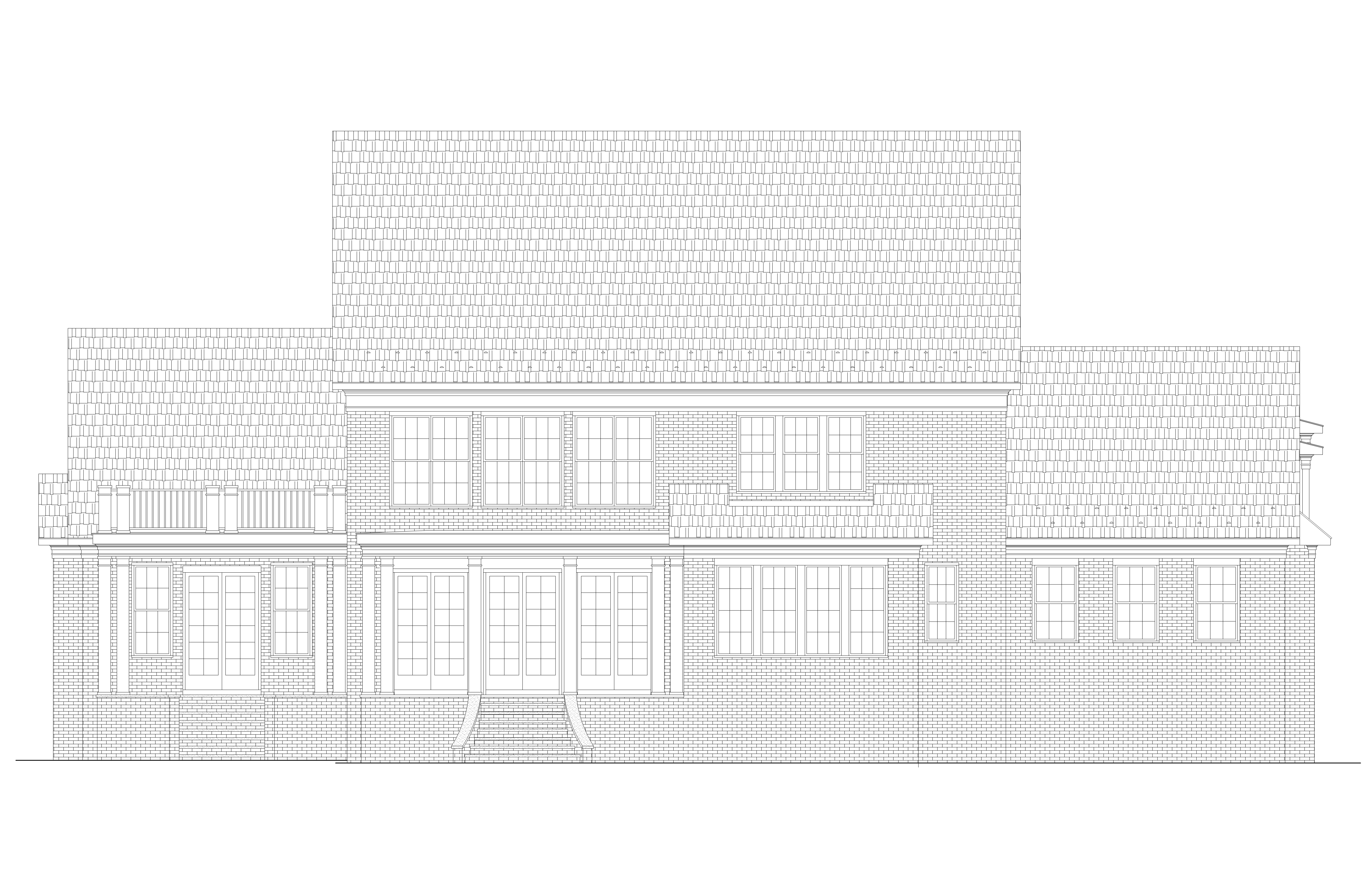 render a rear elevations of a charming traditional house with a warm and inviting atmosphere the house features a brick exterior in cream color complemented by a dark gray shingle roof the large windows have white frames that enhance the brightness add lush green landscaping around the house with vibrant flowers in shades of yellow and purple the sky is a clear blue suggesting a sunny day and the overall ambiance is cozy and welcoming add an in ground pool centered on home