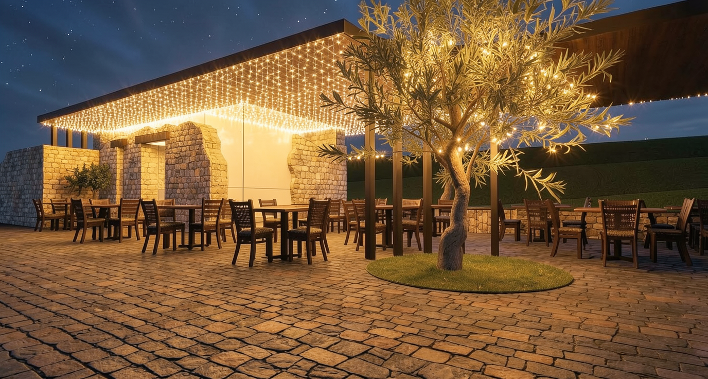 create a tropical exterior view of the maui bay in the distance with rolling grass hills push ocean further into the distance create a tropical feel move ocean further into distance
