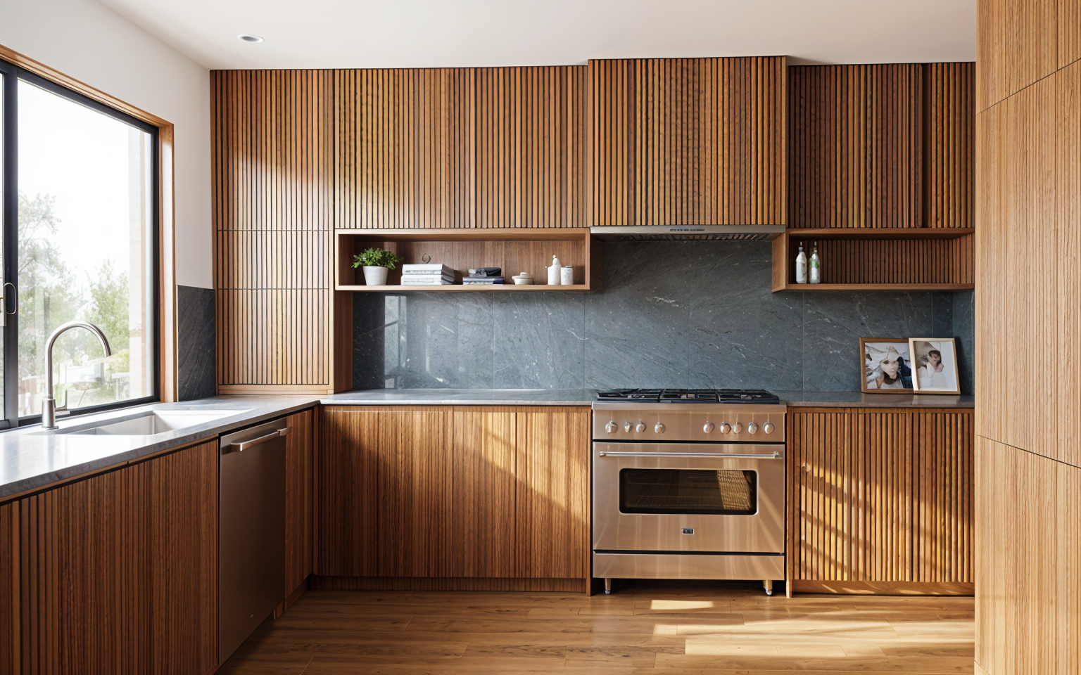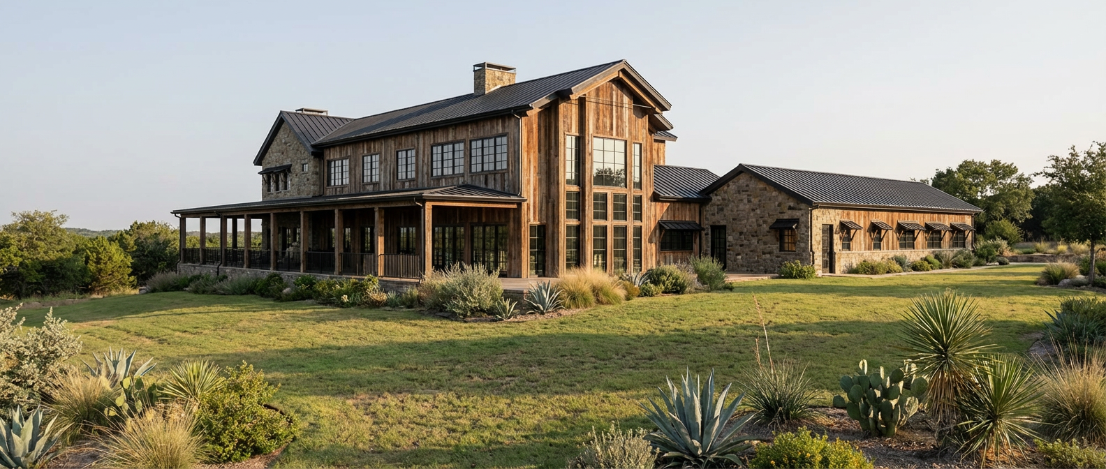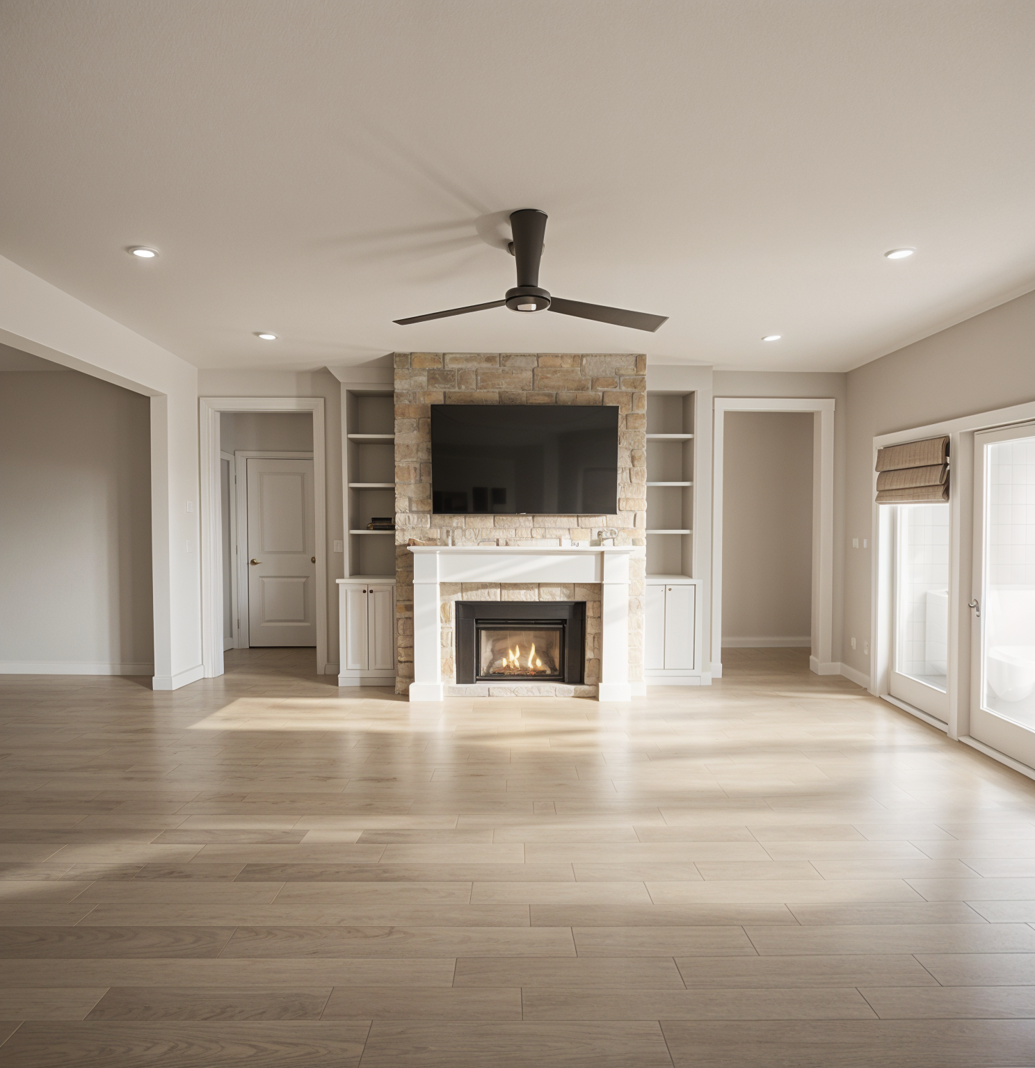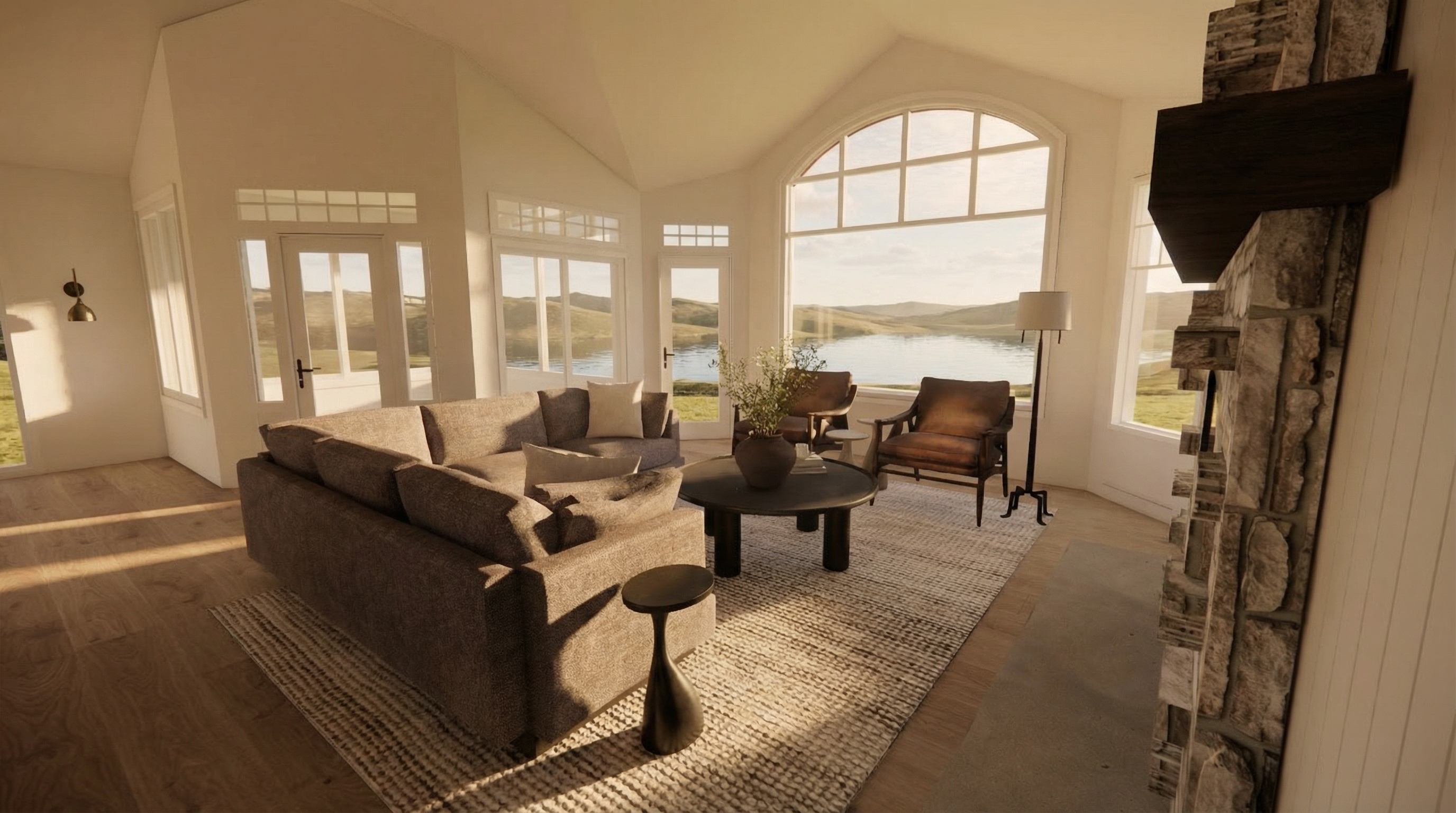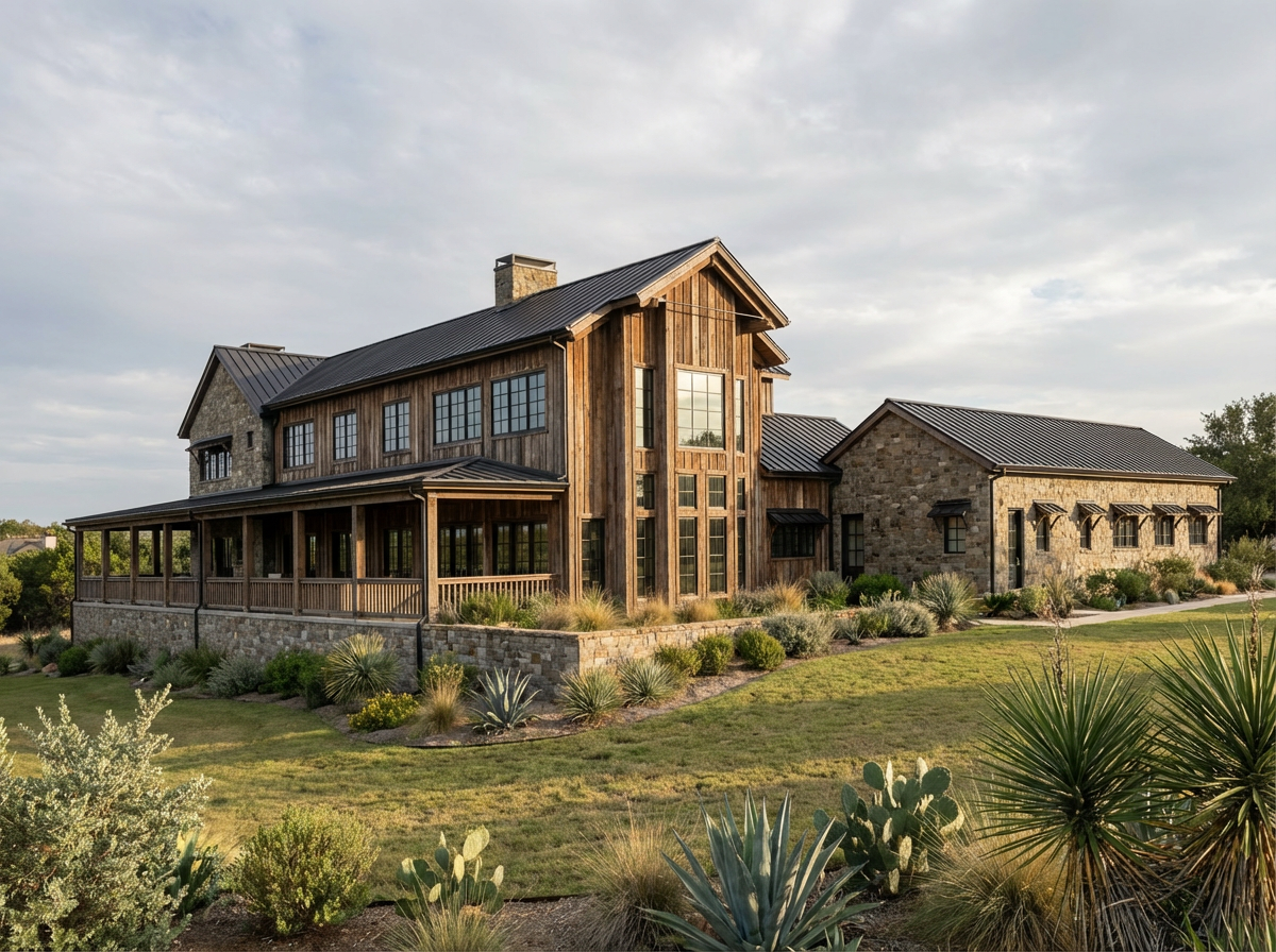 make as photorealistic as possible while keeping textures the same as selection professional landscaping in a lightly wooded scene with good lighting off white brick and light grey horizontal siding