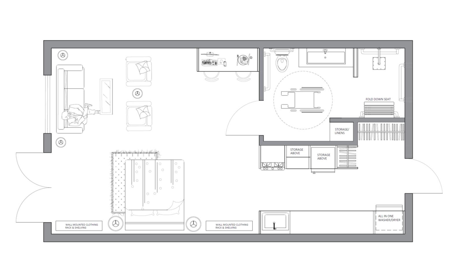 convert this floor plan into a realistic isometric 3d view of a full house show the space from an elevated angle with furniture walls and details visible make exterior steel use the same furniture as shows on the plan do not change the orientation of the floorplan
