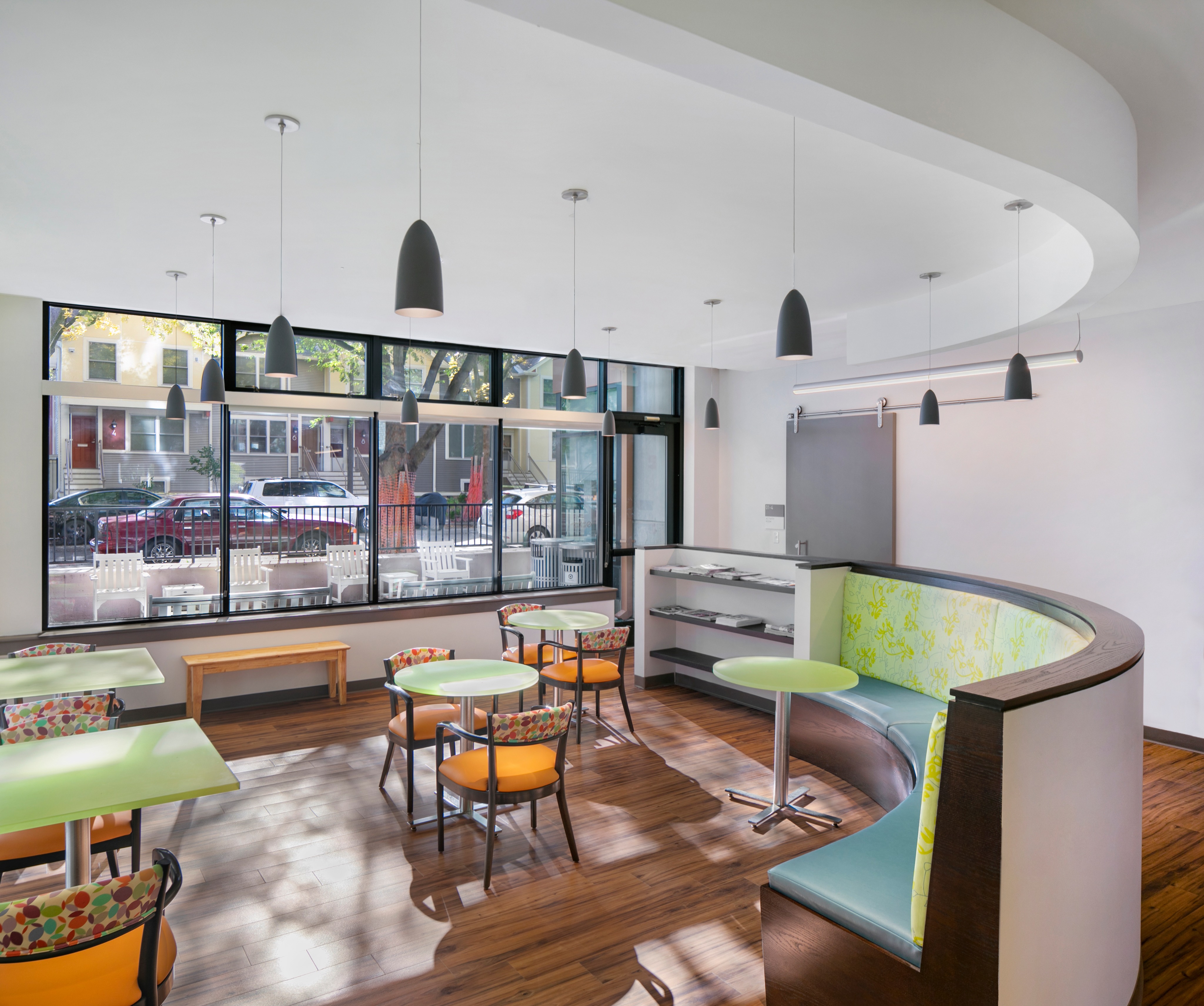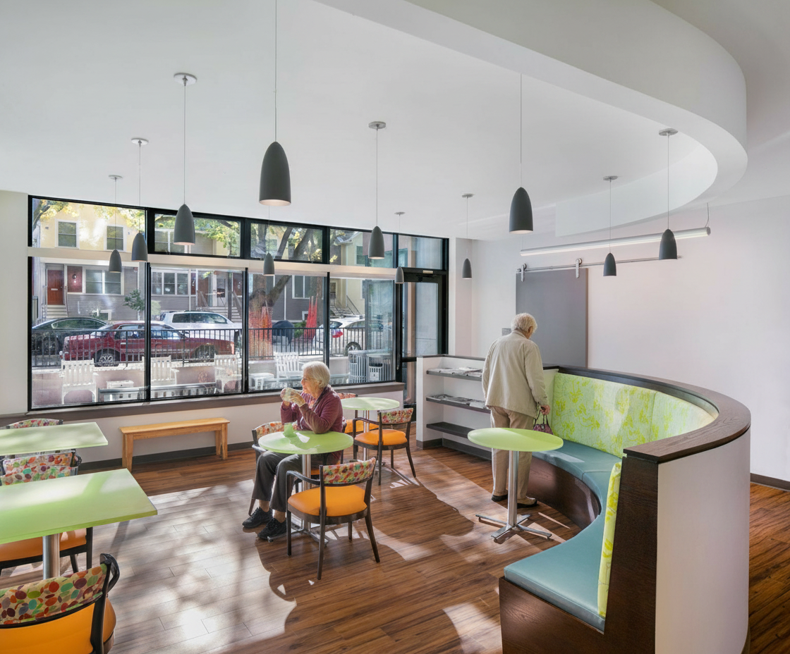 add old person sitting drinking coffee at curved banquette and one old person walking towards door with back to camera positioned at center of exterior windows
