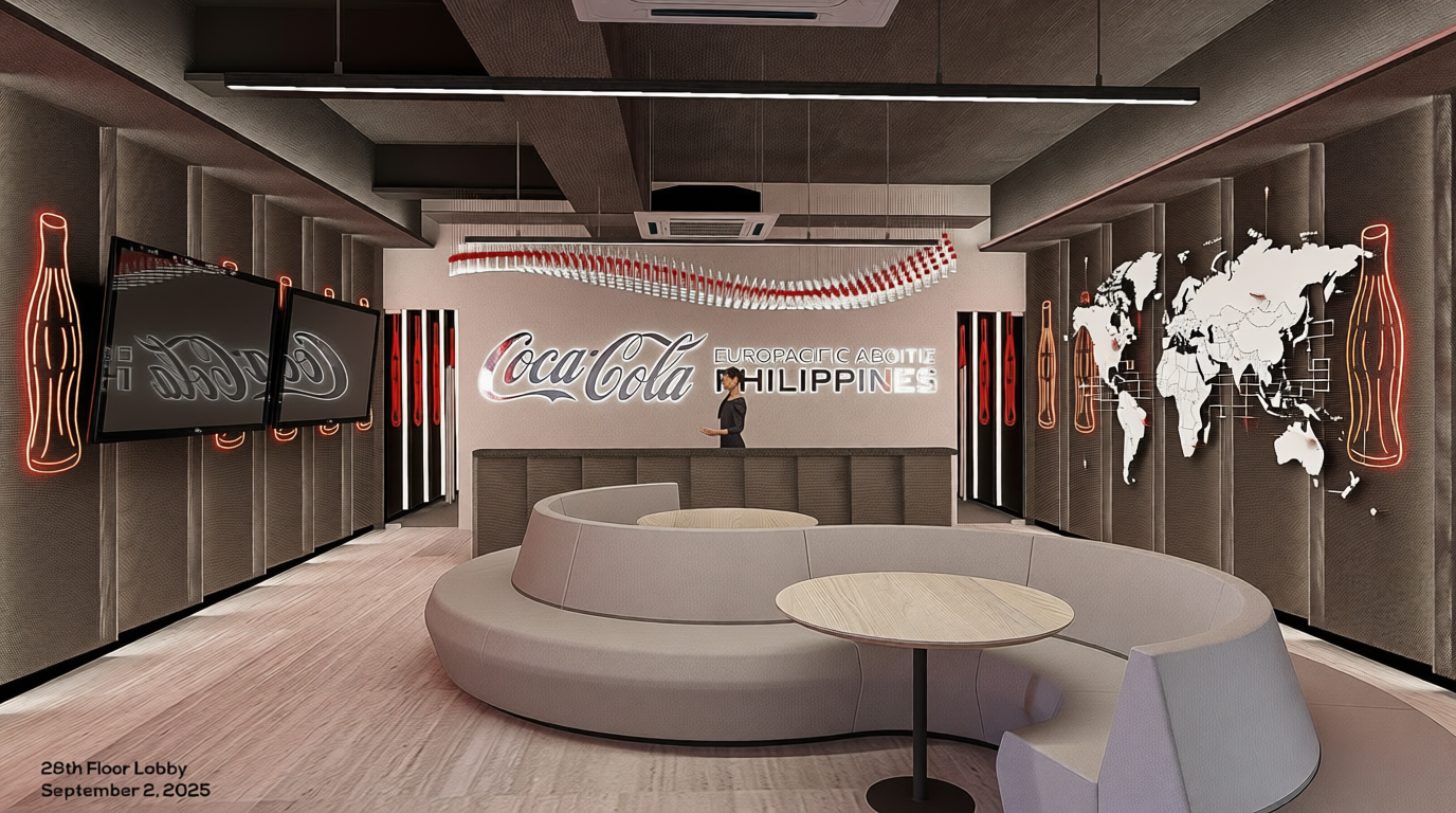 change the design of the left and right wall to have stucco finish remove the neon lights on the left wall are two tv screens with the short side on top and bottom and the long side on the sides displaying corporate items reorient the tvs to be portrait orientation not landscape on the right side is a world map