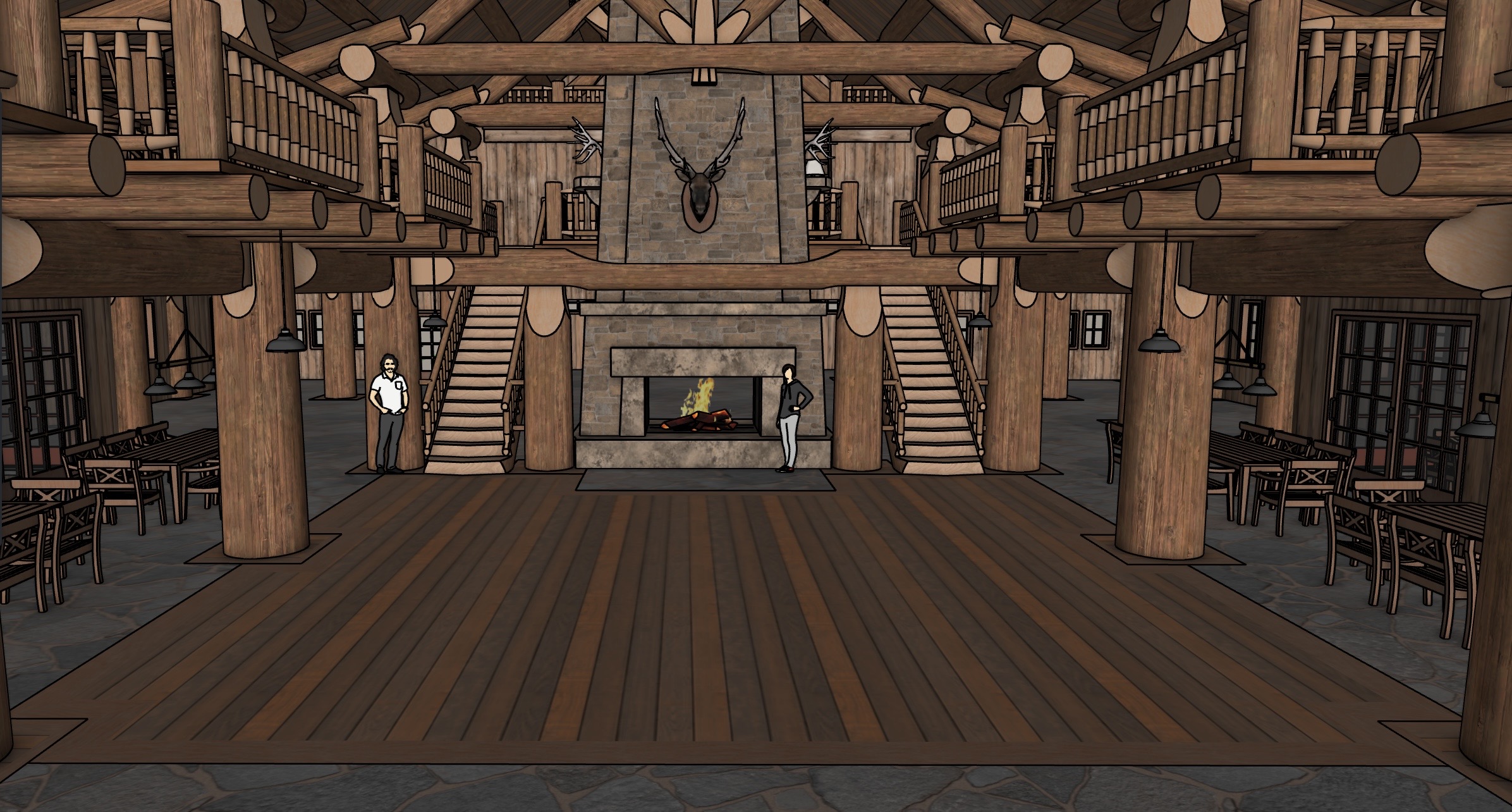 log lodge gathering hall 2 sided fireplace nighttime warm inviting atmosphere