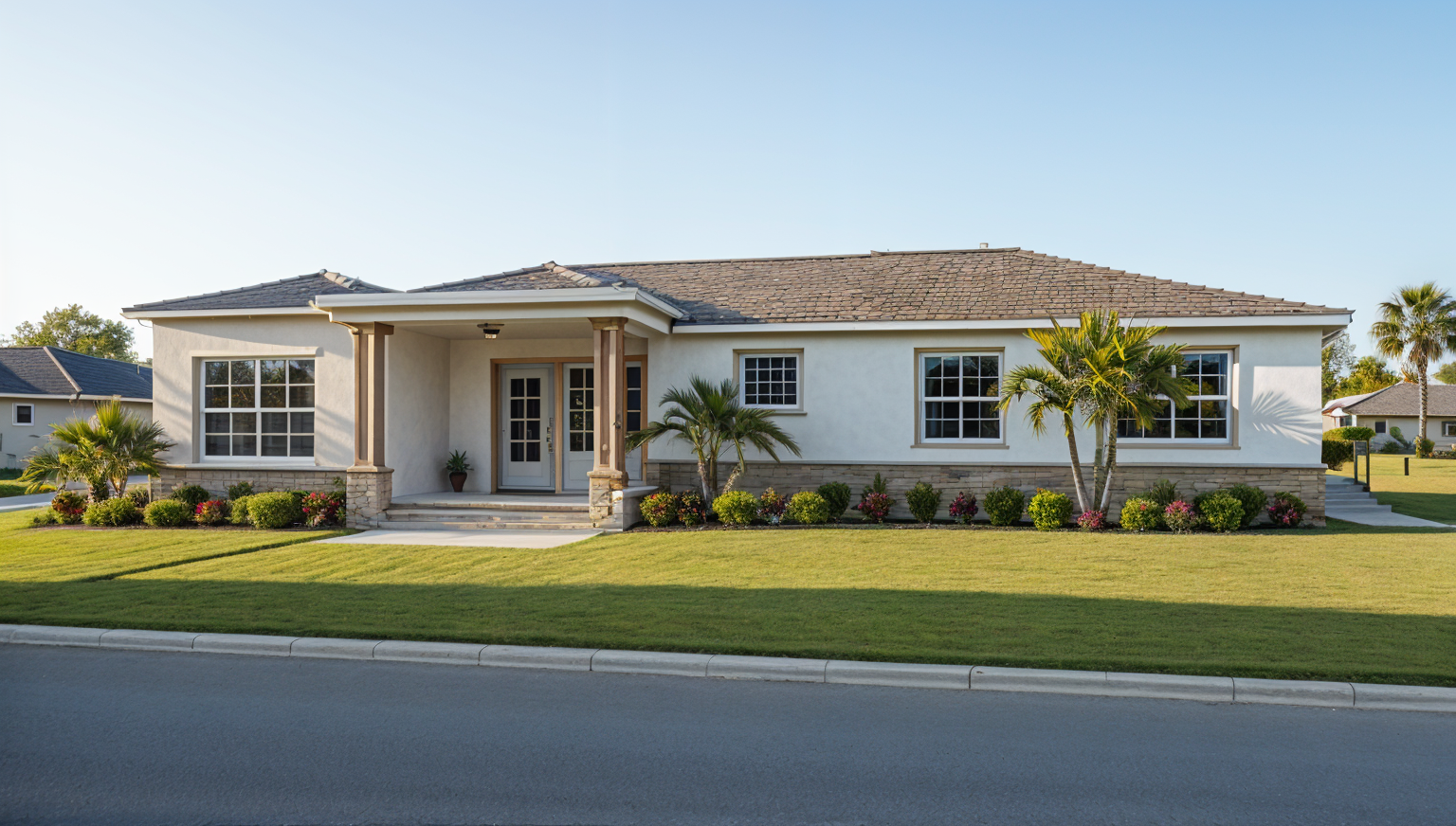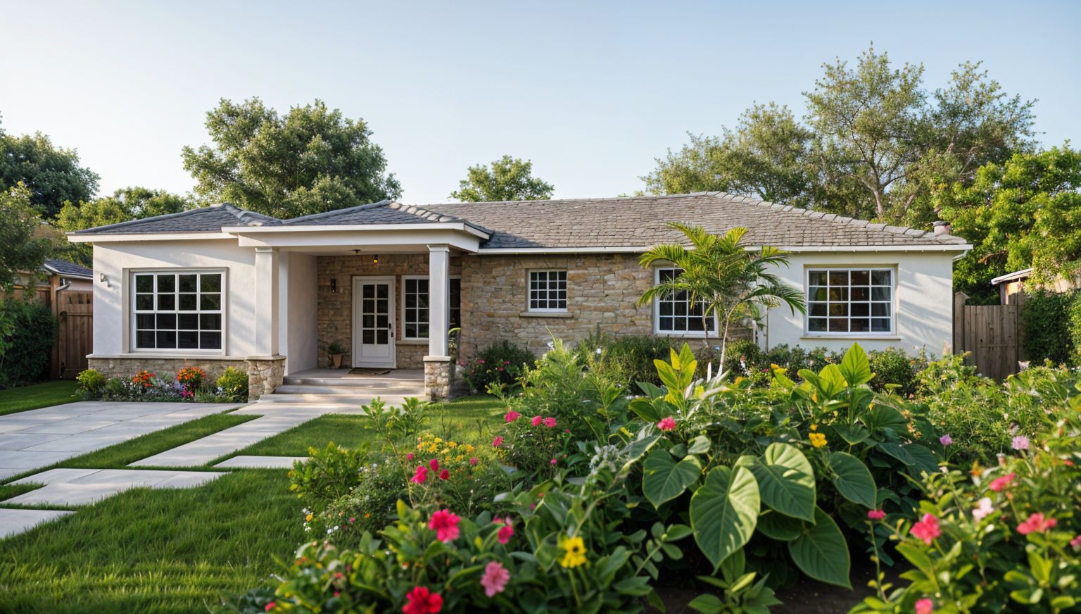 sustainable design exterior shot tropical lush landscape south florida style locate the house in a typical florida neighborhood on a beautiful sunny day white tan stone color texture show trees in the background typical 3 tab shingle roof architecture