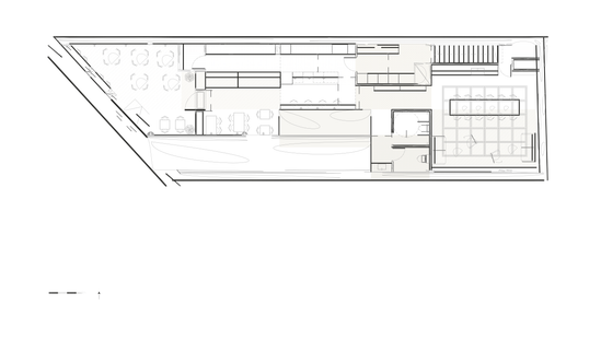 convert this floor plan into a minimalist isometric 3d view of a office show the space from an elevated angle with furniture walls and details visible the place is a specialty coffee use the same furniture as shows on the plan do not change the orientation of the floorplan