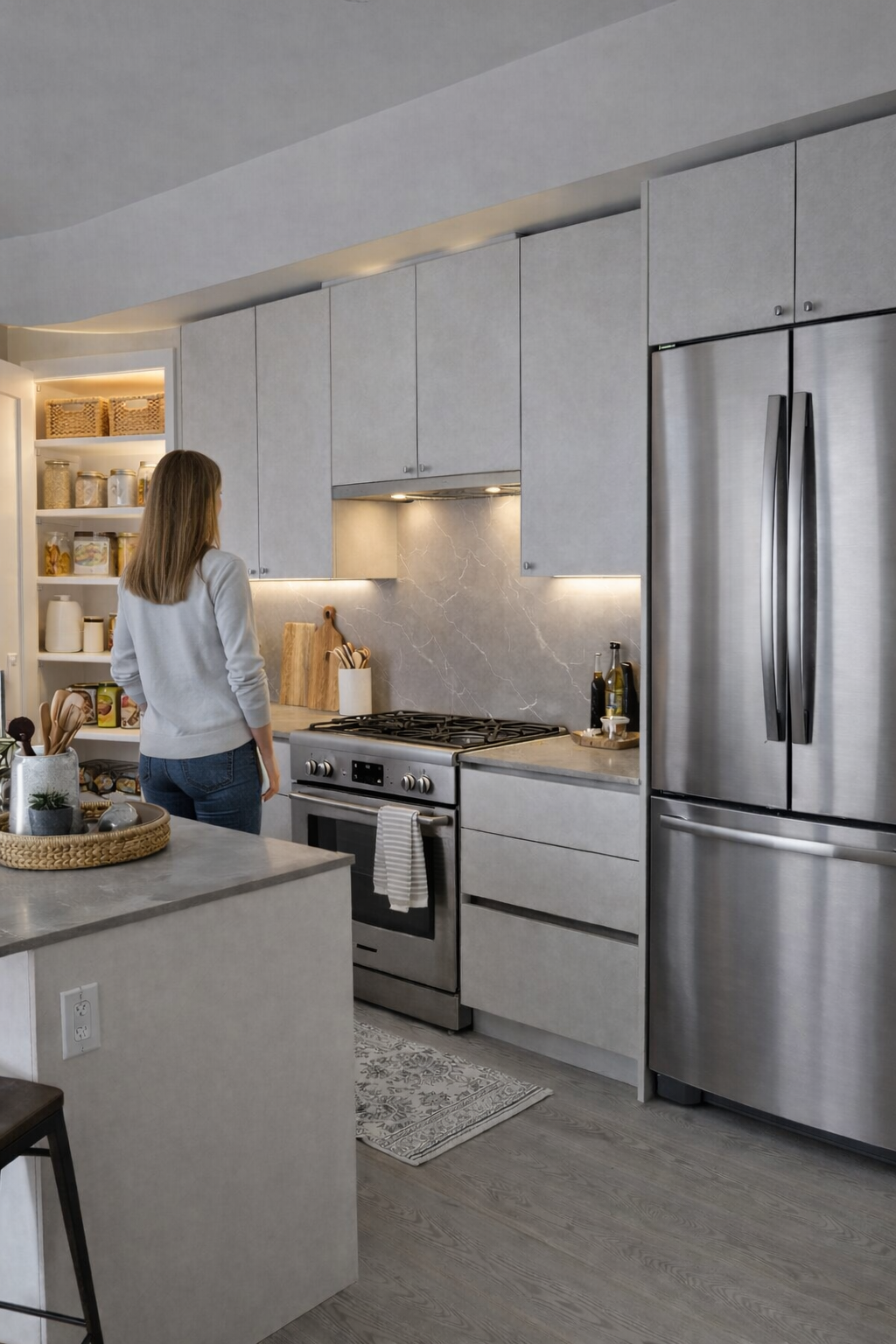 improve the image quality and photo realism take the upper cabinet handles off the woman is reaching for the cabinet