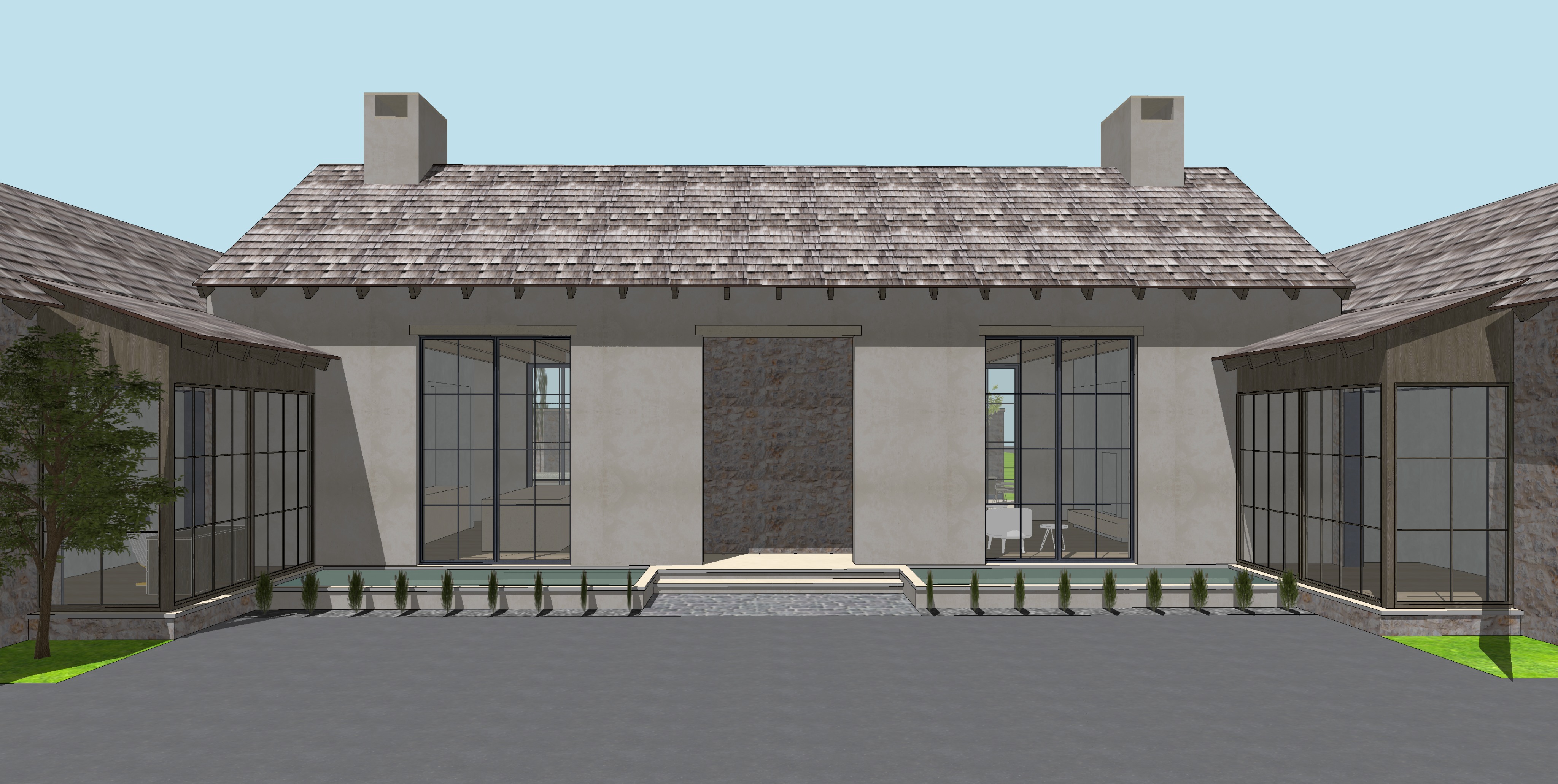 cedar shake roof off white plaster rough cut limestone hewn mushroom siding subtle interior lighting