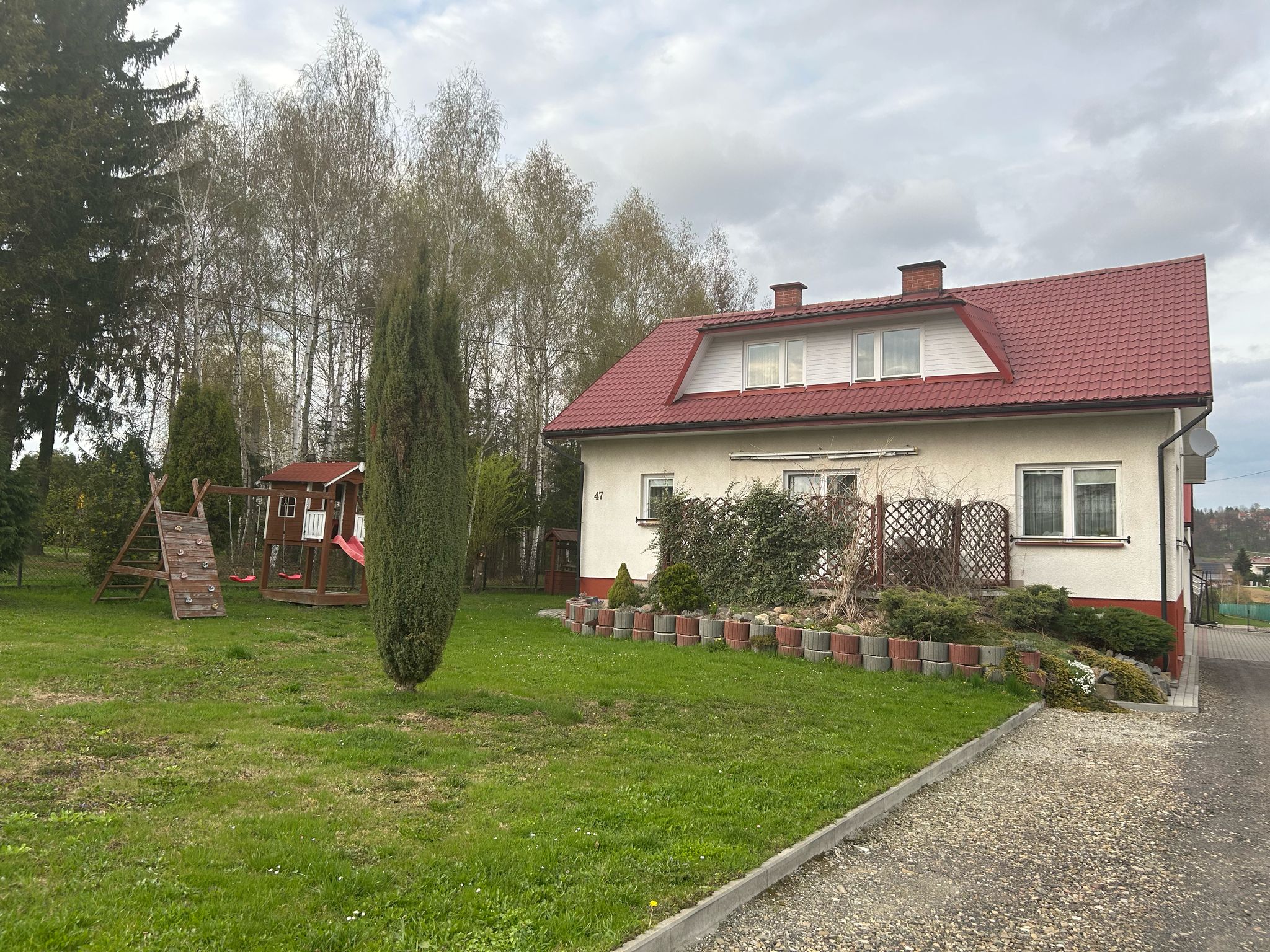 modernist exterior shot a cozy residential garden with existing low stone walls tall conifer trees and pathways preserved between the trees there is a children s playground with a wooden playhouse add numerous flower pots and colorful decorative plants as well as ornamental shrubs and perennials of various heights place decorative planters with flowers geraniums petunias lavender around the walls and house plus climbing plants climbing roses clematis on trellises low growing perennials along the paths in the corners of the property large planters with ornamental grasses miscanthus fountain grass several solar lamps lanterns and string lights create a cozy atmosphere the image should be realistic with bright sunlight in spring or summer and detailed greenery architecture