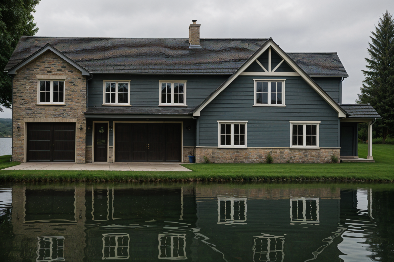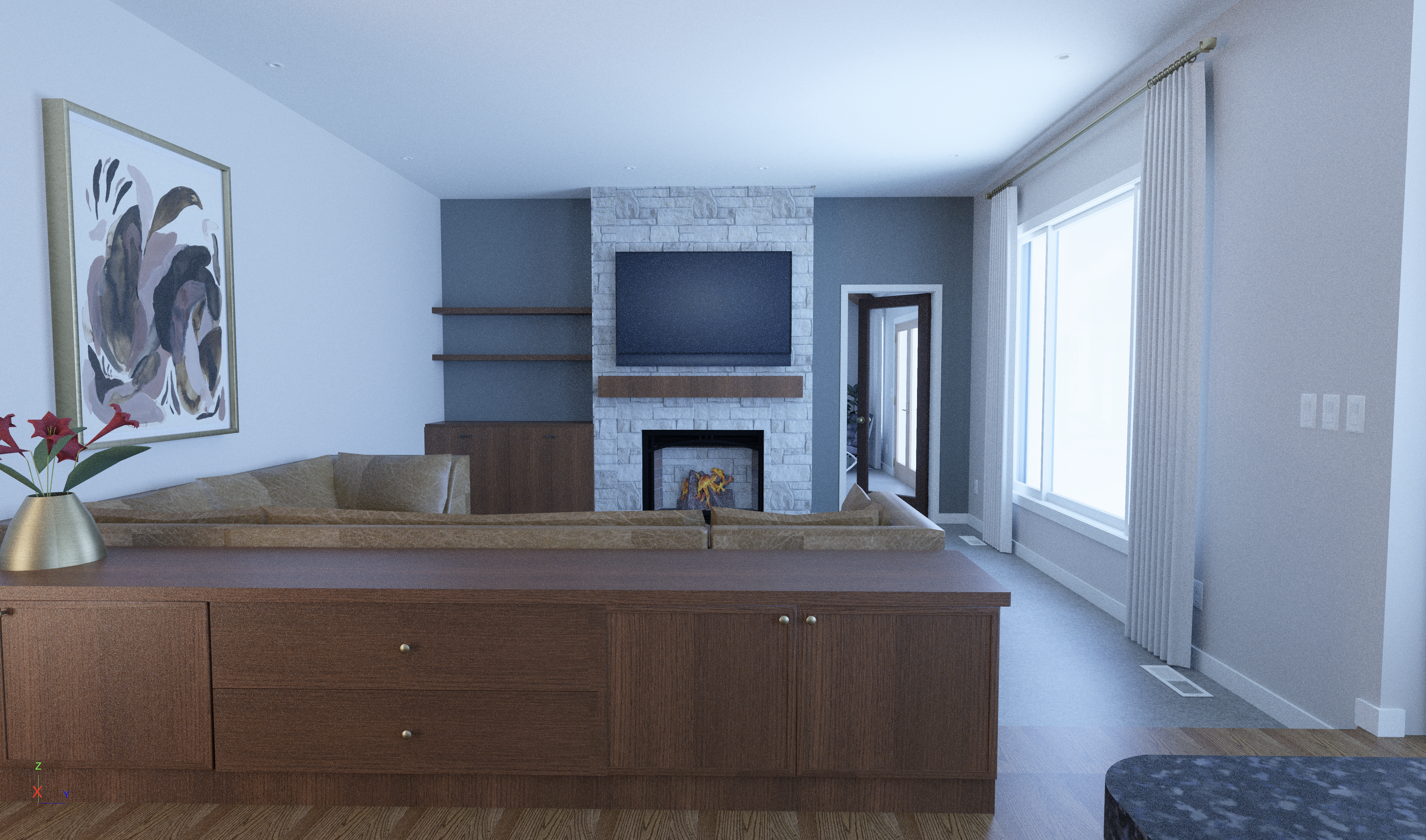 sofa is leather saddle no dining chairs in room behind fireplace cabinetry is made of rift red oak with walnut tone stain