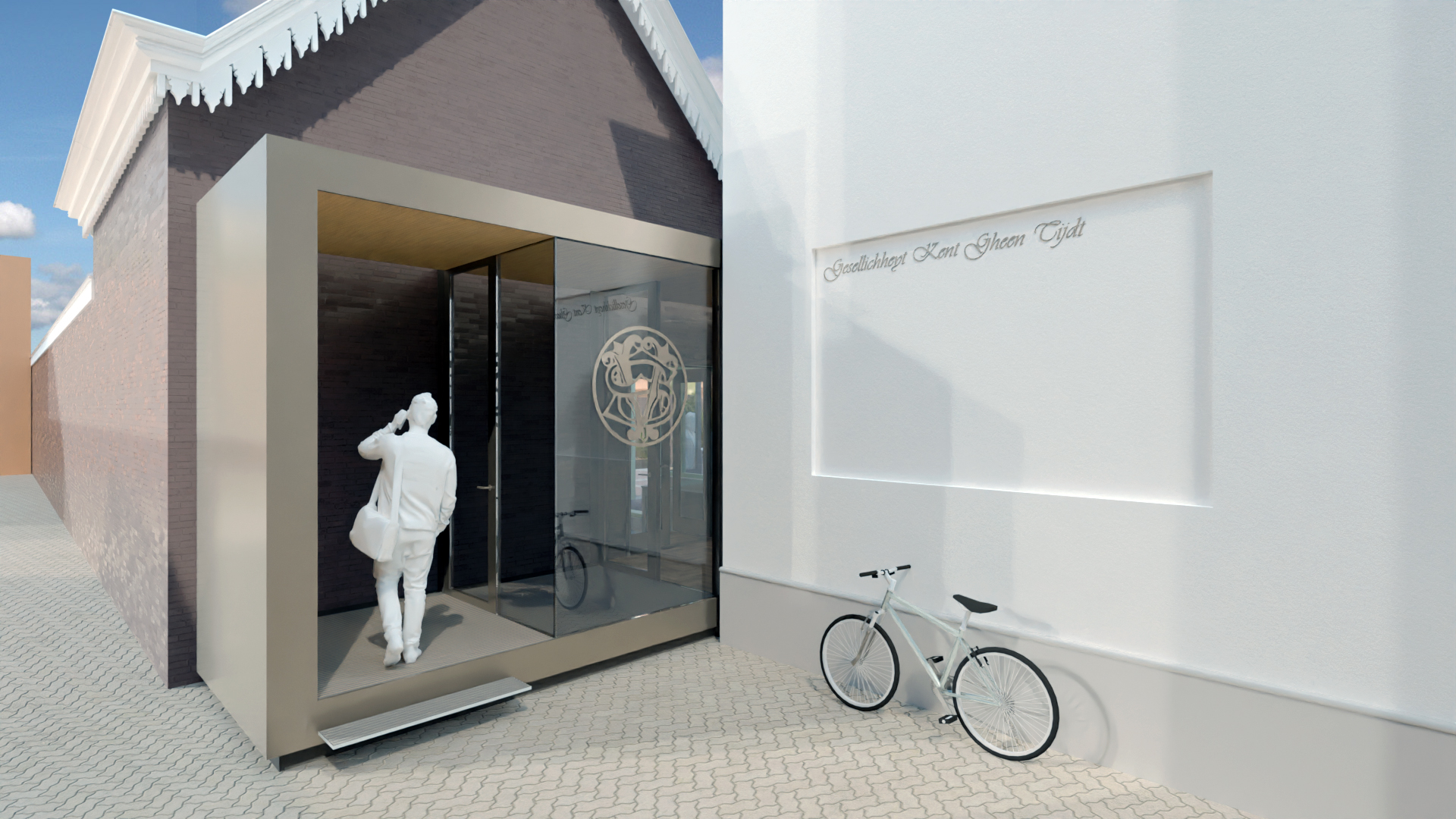 a modern architectural scene featuring a glass entrance with a sleek metallic frame in a warm beige color the exterior wall is a deep earthy brown brick texture contrasted with a pristine white wall on the adjacent structure the pavement is a subtle light gray herringbone pattern a dutch bicycle rests against the white wall painted in soft pastel yellow the atmosphere is serene and contemporary with a touch of elegance and simplicity architecture