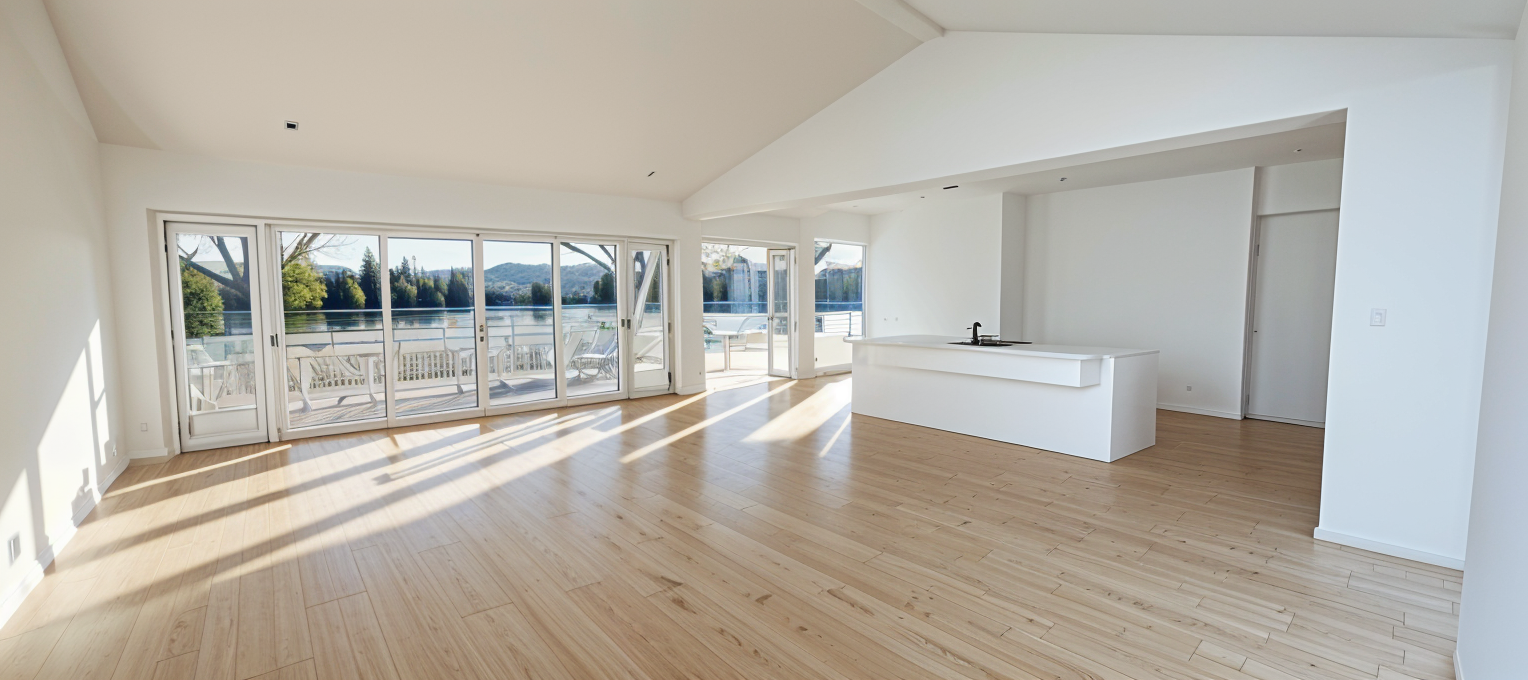 modern interior shot cream walls white trim wood floors wood kitchen cabinets architecture