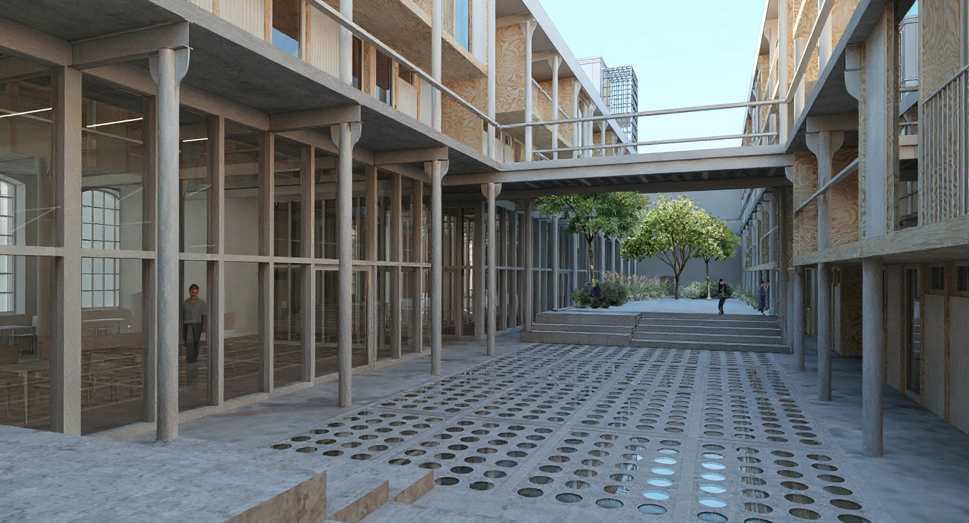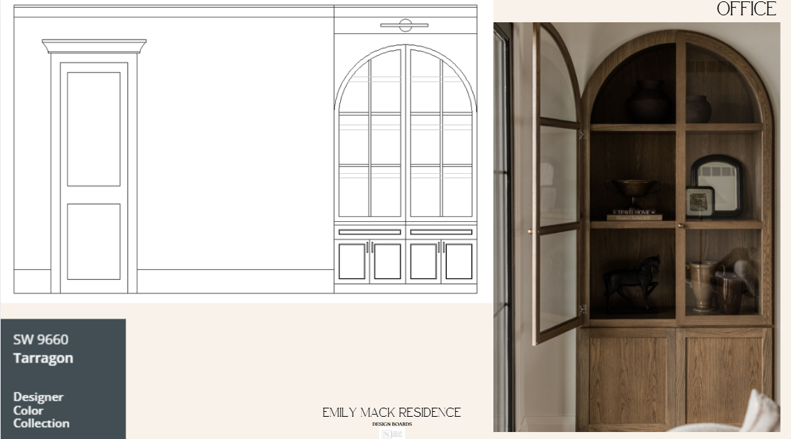 render this room as a 3d realistic photo quality image please color drench the walls ceiling and trim in the sw tarragon color the built in frame and doors will be stained with glass inset like the drawing please add in a bubble chandelier and a wood desk with leather office chair and a neutral oushak rug on the floor please add decor on the shelves inside the cabinet