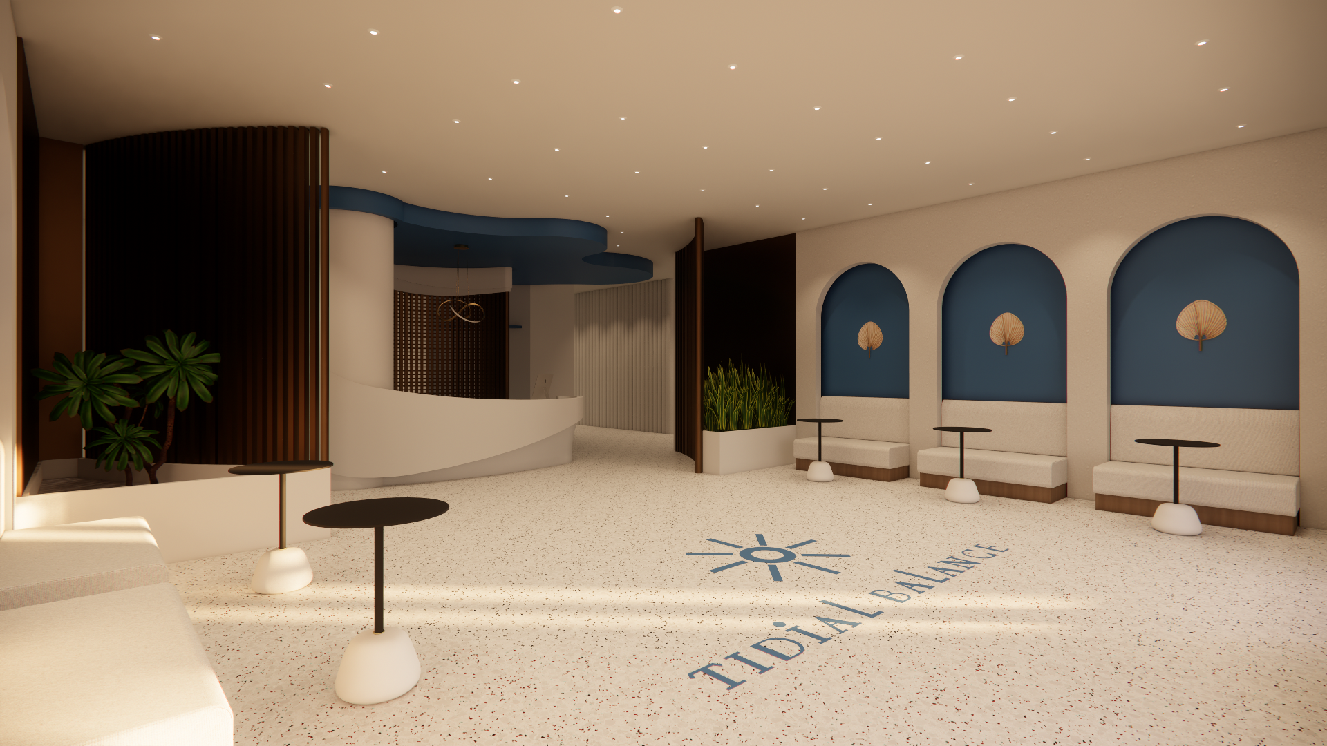 render this realistically change the plants to different plants add a simple blue marble to the reception desk