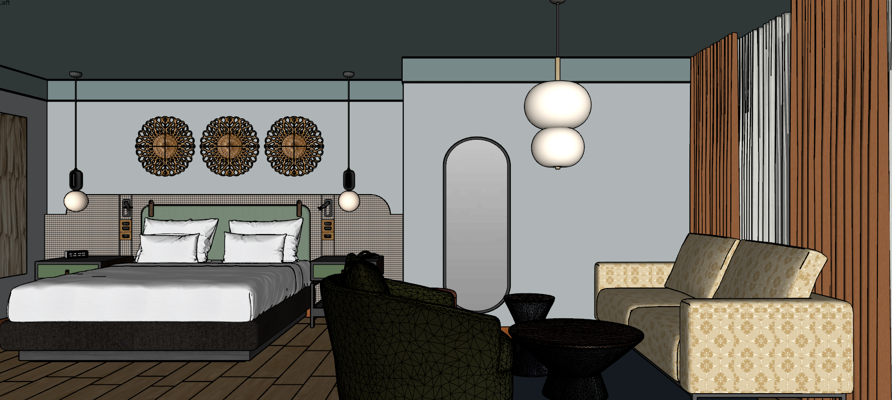 interior shot this room showcases a cozy and contemporary design with warm natural accents the bed is the focal point featuring a sage green upholstered headboard flanked by hanging globe pendant lights with opaline finishes that emit a soft warm glow above the bed three circular decorative pieces made from natural fibers add texture and an artisanal touch to the right there s a seating area with a two seater sofa upholstered in beige fabric with a subtle geometric pattern paired with two black textured coffee tables facing this setup a high back armchair in deep forest green adds contrast and depth to the palette the side wall features a large vertical mirror with a dark frame visually expanding the space and reflecting the light the window treatments combine a sheer white curtain with heavier terracotta colored panels suspended from a wooden slatted divider that also acts as a partial screen the light wood flooring enhances the room s warmth while the use of darker accents in the lighting tables and framing brings balance to the composition altogether the space exudes a serene elegant and comfortable atmosphere perfect for rest and relaxation architecture