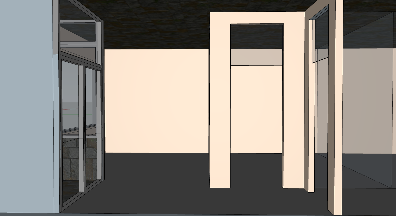 sofa to the left hand room office table to the right hand side room glass doors