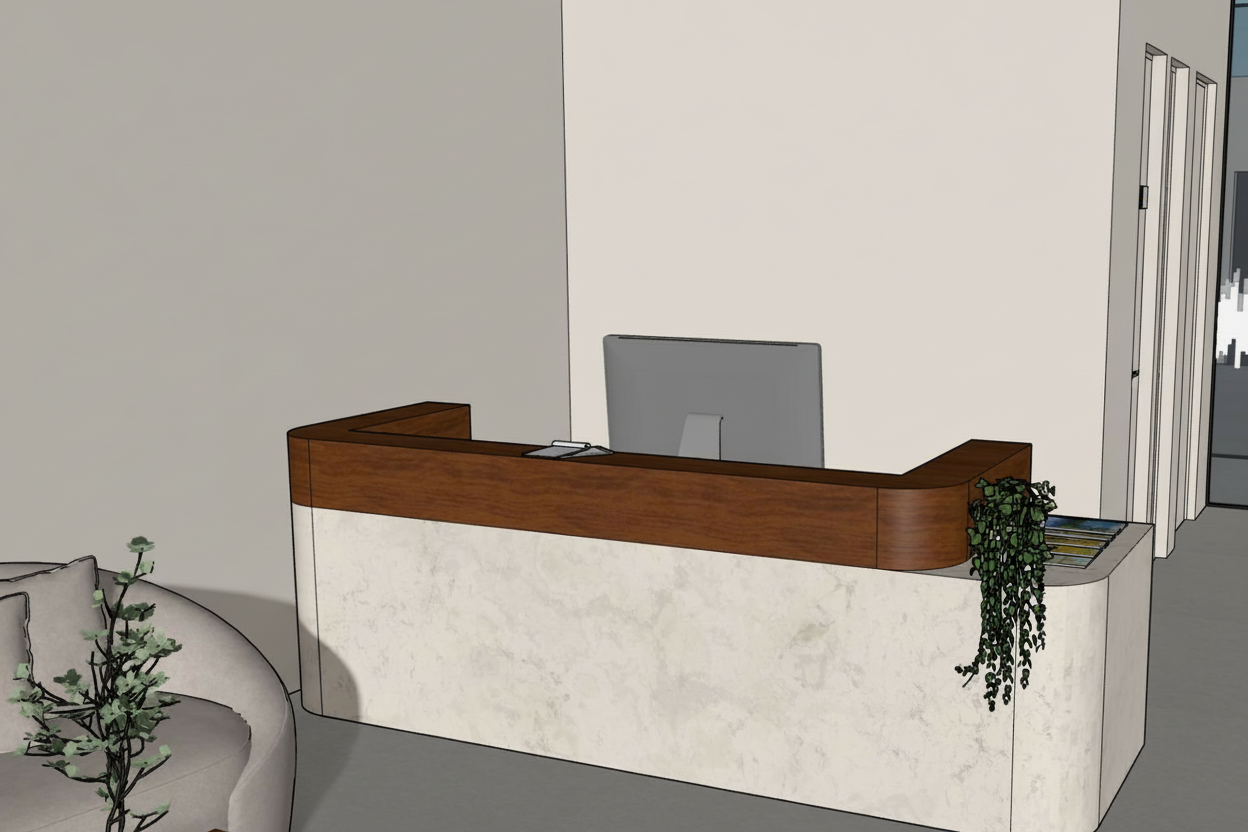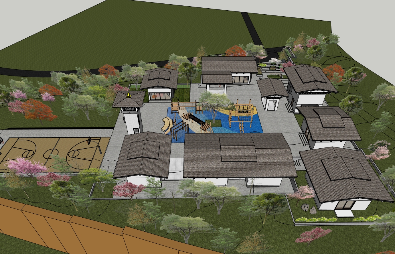 render this exterior sketchup model as a photorealistic landscape visualization matching the mood brightness and atmosphere of the cherry blossom reference photo apply the following sky lighting replace the flat grey sky with a soft clear pale blue spring sky bright airy and clean as seen in the reference lighting should be gentle diffused daylight soft shadows no harsh contrast overall scene brightness should be elevated and luminous light fresh and ethereal not dark or heavy cherry blossom trees replace all existing pink and flowering trees throughout the composition with full bloom japanese cherry blossom trees sakura the blossom colour should be a delicate soft pink to blush white exactly as in the reference photo densely layered cloud like canopies of fine petals trees should feel abundant and enveloping lining both sides of the central axis and flanking the architecture foreground ground replace the dark black pathway with a light warm grey stone or pale granite surface softly lit the lawn areas should be a fresh spring green bright and well lit scatter fallen cherry blossom petals lightly across the ground and steps to enhance the seasonal mood water feature if applicable if a reflective pool or water body can be introduced at the foreground add a still mirror like reflection of the cherry blossoms and sky referencing the tranquil pond reflection in the reference photo architecture retain all existing building forms rooflines terraces and staircase layout exactly as modeled render facade materials in light warm stone or off white plaster to complement the soft pink blossom palette dark roof elements may remain as contrast overall mood soft poetic japanese spring garden quiet luminous and romantic reference hirosaki castle cherry blossom park japan photographic quality wide landscape composition there is no water