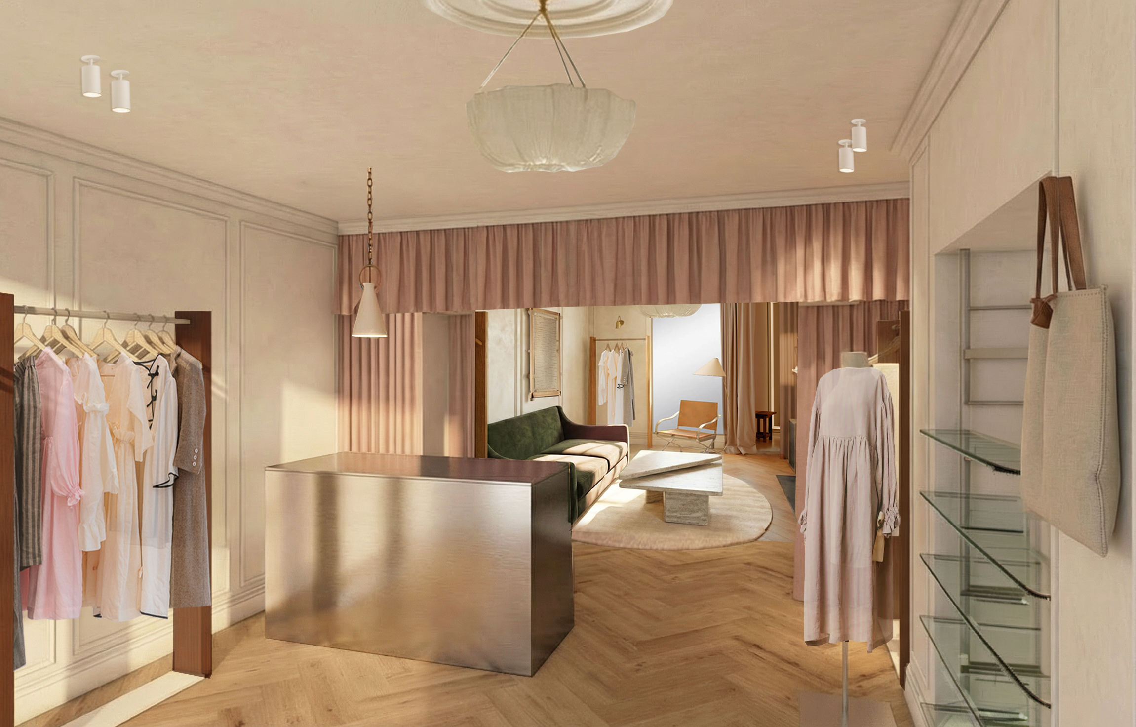 add 3 no people into view 1 looking at clothes at the front 1 behind counter and 1 sitting on the back sofa do not change any of the other details