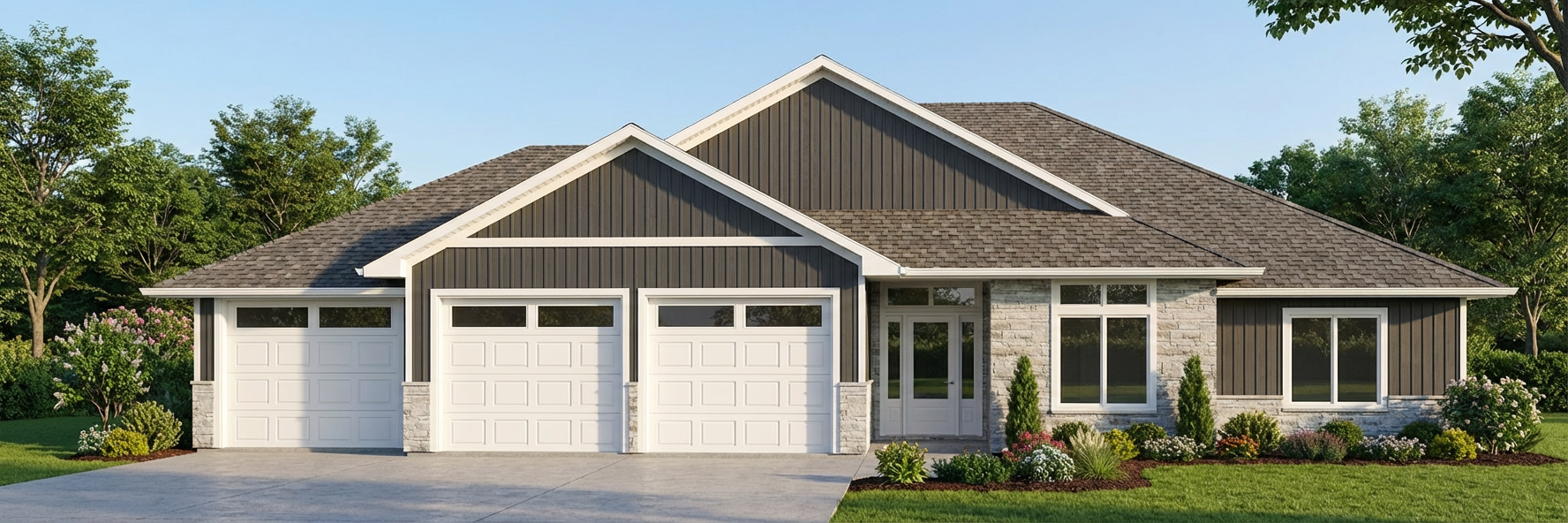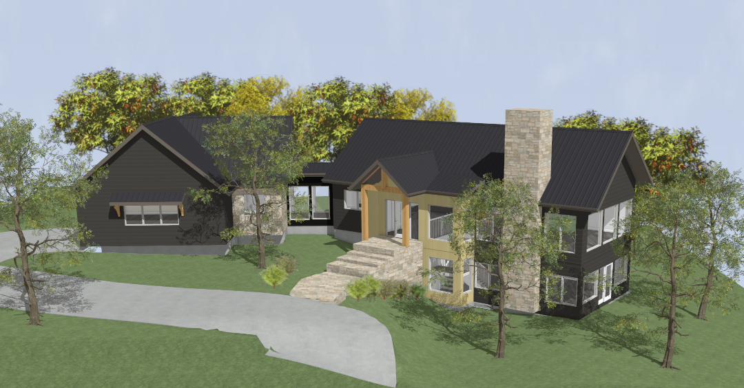 add home onto a heavily wooded lot with mature oak trees summertime golden hour lighting white oak vertical siding by front door rustic beams