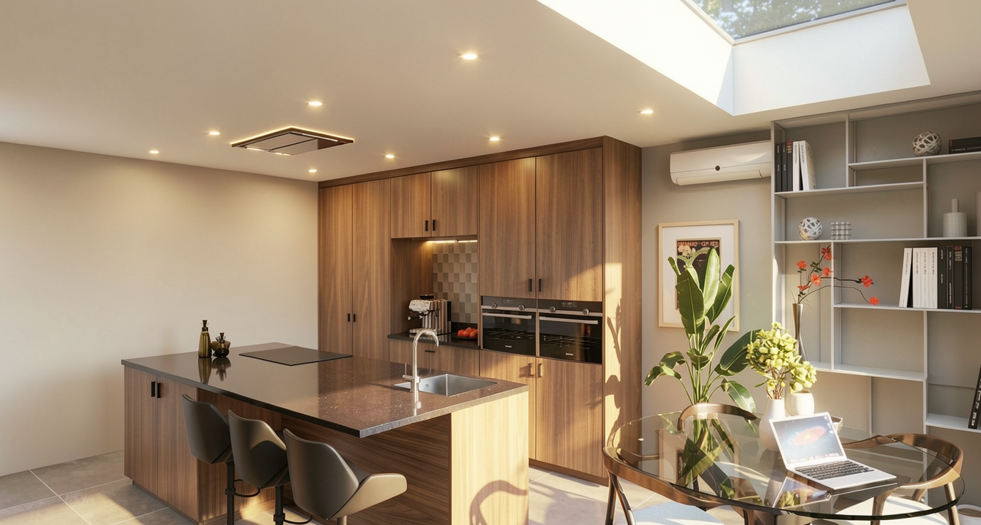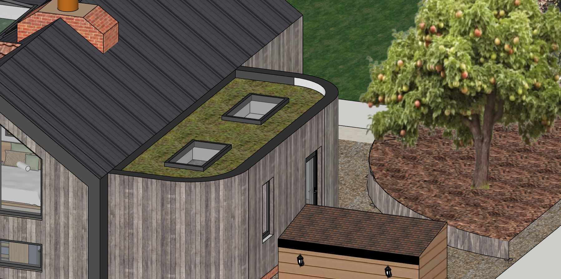 a silver grey tone vertical timber clad building with curving walls has a flat roof wity 2 sky lights and a living green roof element on top next to a curving raised bed area using vertical timber sleepers to retain a area of bark beneath a apple tree