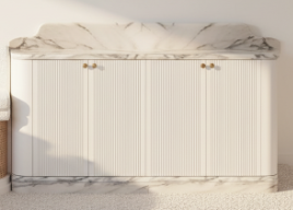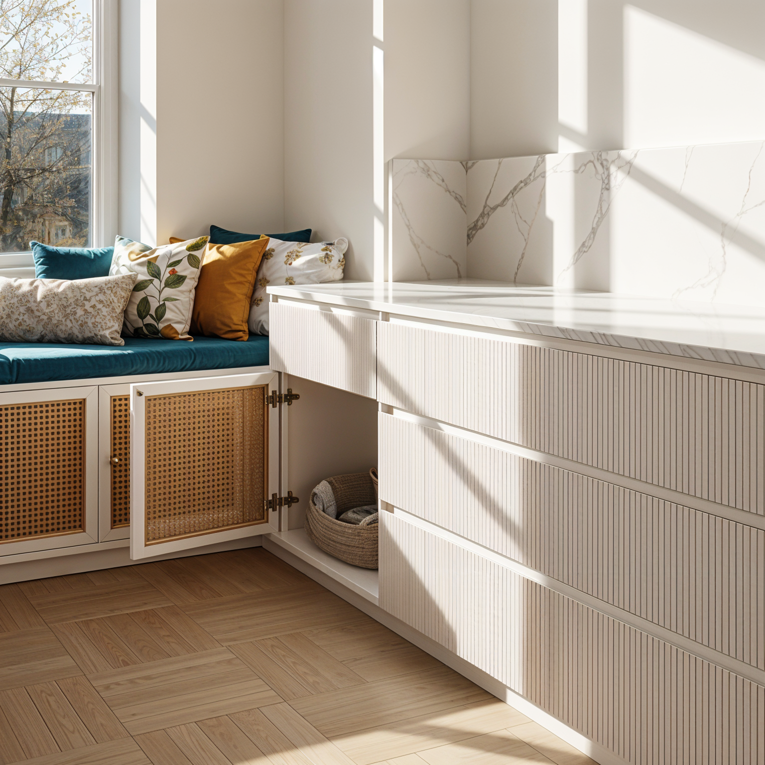 extend this joinery and integrate a brushed nickel metal grille in two of the doors for a dog bed architecture