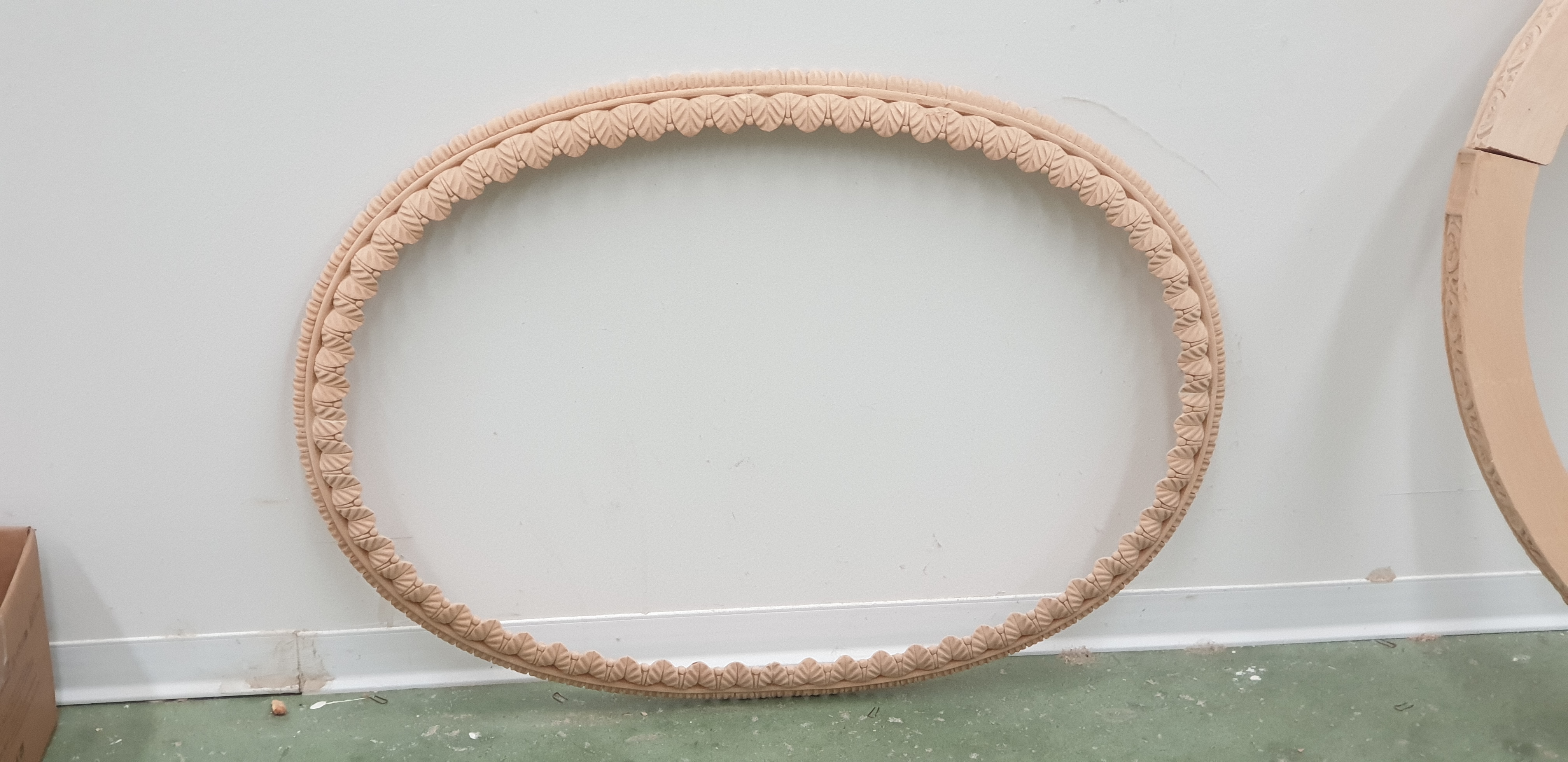 create a beautifully rendered image of an ornate oval wooden frame with intricate carvings the frame should be a rich warm oak color with detailed elegant patterns set against a smooth light beige background to contrast the frame creating a sense of simplicity and elegance the atmosphere should be serene and classic evoking a sense of timeless beauty