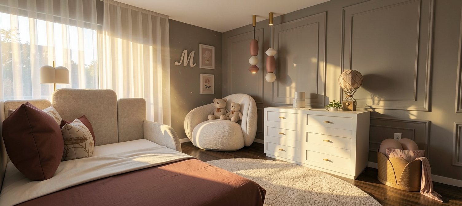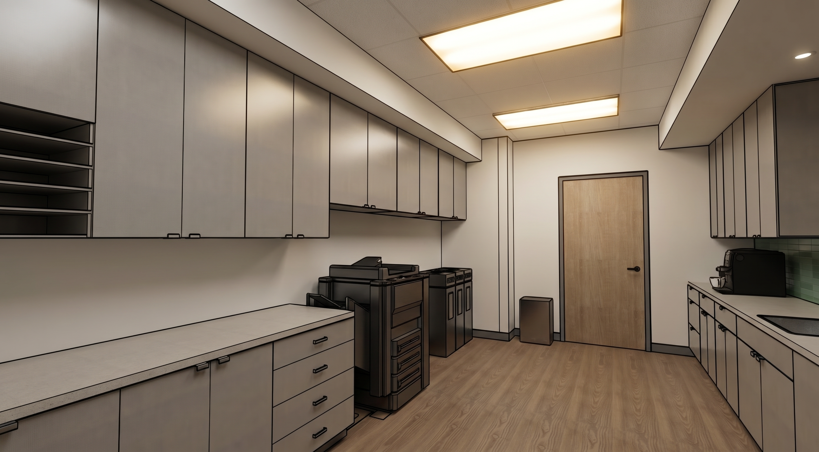 exact render of this but make it realistic for reference the wall behind the desk is the neutral colour of the other walls but reeded design the left hand bookcase door has glass show the lights on all wardrobe panels that aren t shown pink should be in the neutral wall colour