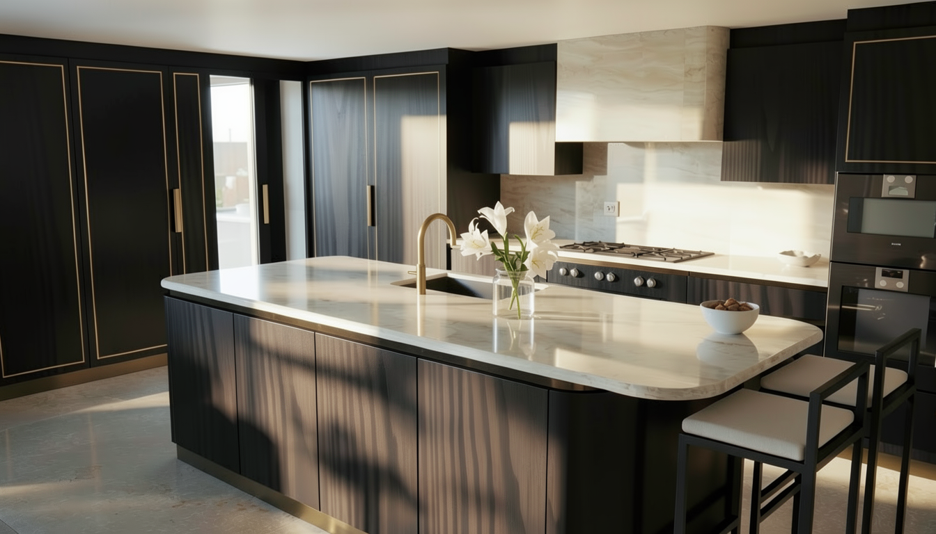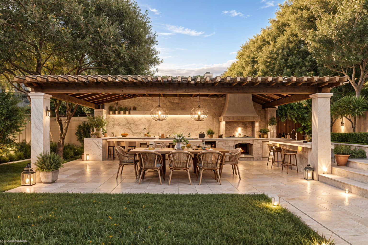 material replacement and enhancement only keep all geometry structure proportions layout camera angle and forms exactly the same as the input image do not add remove or alter any architectural elements redesign surfaces only replace materials precisely 1 wood soffit and cladding warm honey brown teak or ipe horizontal wood boards in parallel stripes natural linear grain texture matte oil finished surface transparent oil or wax no lacquer golden brown tones 8b6a3e c49a5a apply to all roof soffits large external terrace and entrance ceilings and vertical cladding on the right building volume 2 stone facade irregular polygonal mosaic of natural limestone or travertine slabs in light warm grey beige tones c8c2b6 dedad2 matte rough textured surface thin dark mortar joints emphasizing mosaic pattern cover all main walls pillars and columns for tectonic mass 3 steel trims dark anthracite matte powder coated steel profiles 2e2e30 3d3d3f very sharp thin edges apply to roof fascias overhangs section frames and window frames for high contrast 4 glass large floor to ceiling glazing panels with minimal dark anthracite steel frames frameless appearance high transparency slightly reflective blue grey tinted glass with subtle sky and vegetation reflections enhance all first floor windows and ground level storefront glazing lighting natural late afternoon golden hour sunlight from low angle upper right warm glow highlighting textures long dramatic shadows on facades and ground realistic reflections on glass blue grey sky greenery and subtle highlights on steel wood stone high dynamic range soft ambient fill for depth photorealistic ultra hd render sharp details premium architectural quality architecture