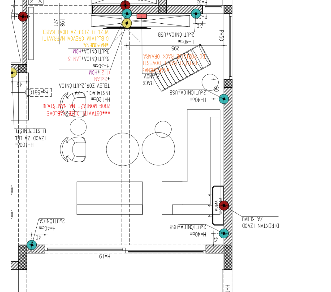 convert this floor plan into a realistic isometric 3d view of a full house show the space from an elevated angle with furniture walls and details visible foreground immediate immediately in the foreground closest to the camera and centered on the left are two modern armchairs with high curved backs and integrated headrests upholstered in a soft light taupe fabric they are positioned facing the center of the room separated by a small perfectly circular minimalist side table midground the central floor area finished in warm polished concrete is defined by a large low pile area rug with a subtle woven texture centered on this rug are two tiered overlapping circular coffee tables the lower one is slightly larger with a light wood top and the upper one has a dark smoked glass top with a minimalist black metal frame background far wall running the length of the far wall is a long low media console unit made of dark textured wood a significant detail is the distinct insert on the far right of the console which is a specific patterned and textured wood weave panel above this entire console unit a large thin flat screen tv labeled as murphy unito 26 is cleanly wall mounted right corner seating area this corner is the most complex the main seating a large l shaped sectional sofa is positioned in the midground and fits into the far right corner it consists of multiple modules with the main murphy unito 26 module running along the far wall and a second more angled murphy unito 26 module extending along the right hand wall the sofa is a light natural grey linen fabric the seating surface is meticulously adorned with specific decorative cushions a curated mix of striped blue and brown poncho patterned cushions interspersed with plain deep blue velvet and cream colored cushions all precisely positioned to match the notes on the plan a unique matching striped poncho daybed element is seamlessly integrated into the corner right wall the entire length of this wall is dominated by a massive floor to ceiling glass sliding panel system sliding doors that opens onto a finished stone patio and garden the views are expansive and the room is bathed in natural light far right corner tucked in tucked under the angled corner and alongside the large glass doors is a separate freestanding daybed labeled poncho this long upholstered daybed features the distinct blue cream and brown striped poncho pattern and is angled just as on the plan accompanied by a small striped rug and a small round side table with a black base and a brass top overall impression all construction debris is gone the walls are finished in a combination of warm textured plaster and specific dark fluted wood paneling accents the raw wood krovna konstrukcija is cleaned and finished with the complex linear led grid lighting system carefully installed to follow the roof shape the overall ambiance is sophisticated meticulously coordinated and warm with every piece of furniture cushion color and texture exactly as specified use the same furniture as shows on the plan do not change the orientation of the floorplan