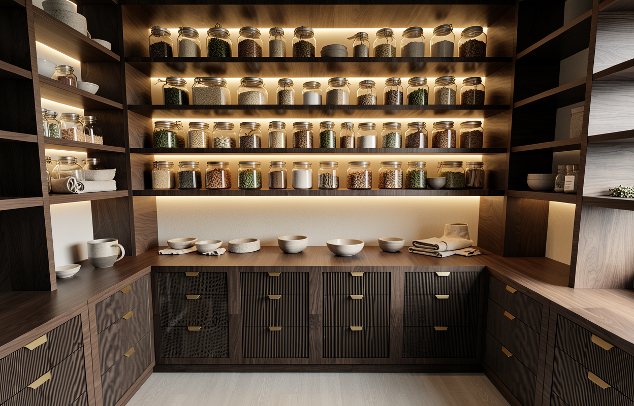 zaha hadid detail shot cinematic professional architectural photography of a bespoke walk in luxury pantry architectural digest cover quality realistically rendered texture on dark walnut fluted cabinet doors with minimalist brass handles ultra detailed materials lighting hierarchy primary light the scene is defined by a deep sculptural sense of dimensionality integrated ultra warm 2700k led strip lighting is tightly recessed beneath every shelf this light is subtle and indirect casting a dramatic focused downward wash over the labels and contents of the glass jars the led source itself is hidden from view secondary ambiance the background walls behind the glass jars feature a textural linen wallpaper in a warm beige tone softly illuminated by the indirect led glow contrast and depth dark rich shadows are deliberately maintained in the corners and the deepest crevices of the shelving creating a sophisticated chiaroscuro effect the edges of the wood shelves are highlighted while the gaps are shadowed reflections the hundreds of uniform glass apothecary jars filled with grains spices and dried herbs catch warm point light specular highlights from the leds making them glimmer styling composition perfectly curated shelves styled with organic modern ceramics woven baskets and uniform labels soft natural side ambient daylight from an unseen window balances the warmth 8k resolution photorealistic depth of field architecture