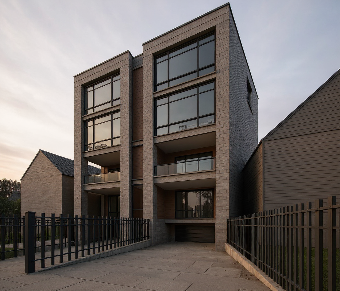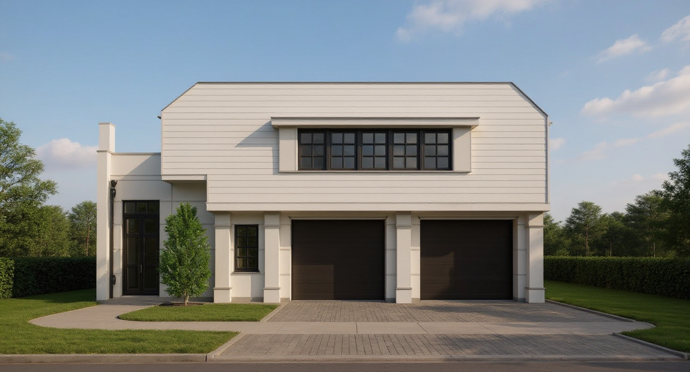 generate a hyperrealitic visual of this architects sketch dont change any persepctives or any of the building design make it look new and realistic make the walls and off white render and columns are a limestone colour and the roof is slate grey make the driveway an off white resin