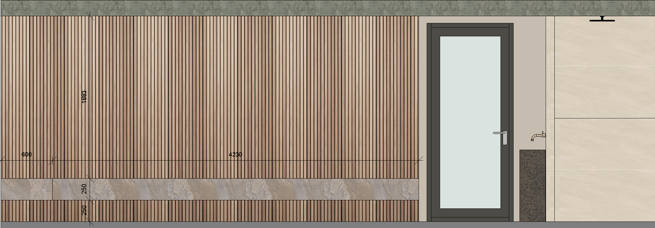 add fluffy beige pillows on bench seating bench to be microcement in beige door to be fluted glass
