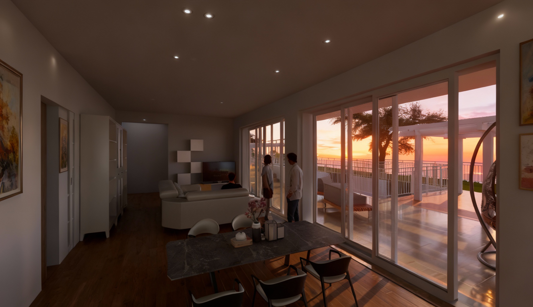 aggiungi molti faretti aggiungi quadri aggiungi 2 persone metti tramonto aumenta luninosit
