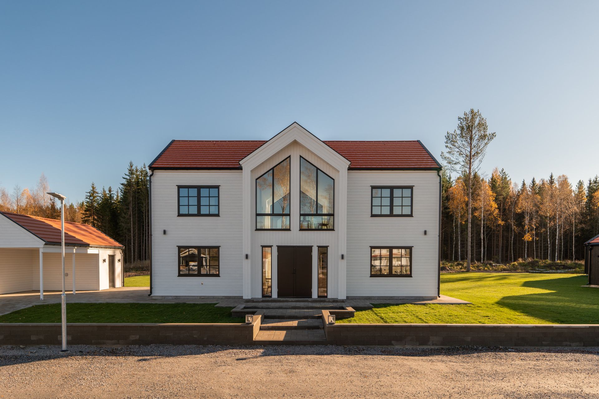 beh ll huset men ndra tomten huset st r en bil in p den nya tomten tomten r v dligt plan i bakgrunder r det l tt b ljande lanskap skog syns f rst v ldigt l ngt borta tomta kan vara mer av en nyettablerad gr smatta ingenuppm rad del framf rhus kanske n gra utem bler p sidan av huset bil parkeras snett p sidan framf r hus men ej s det t cker huset carport och pool ska inte vara med