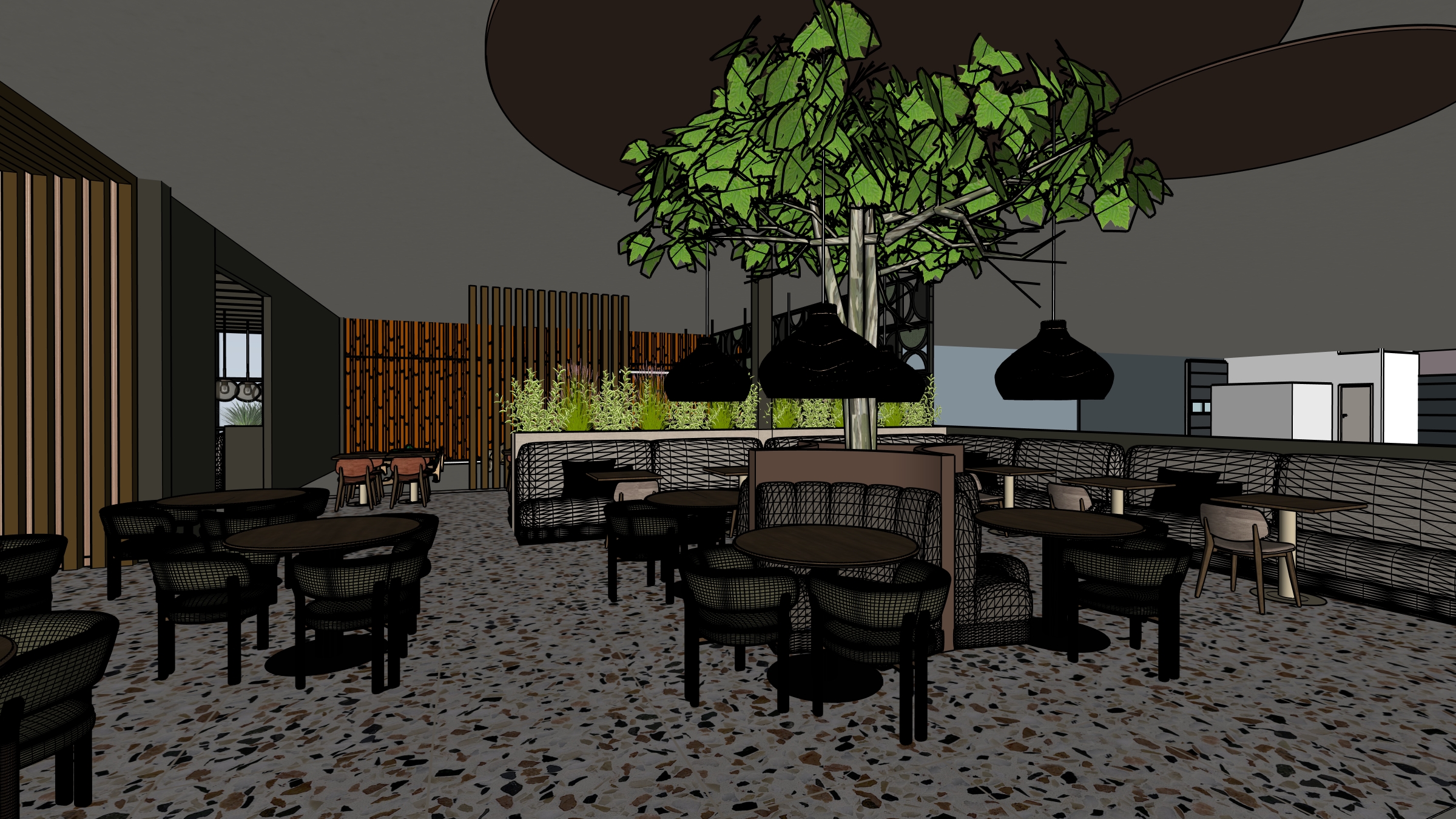 a photorealistic high resolution interior architectural photograph of an intimate cafe seating area meticulously derived from and matching the enclosed axial eye level perspective and geometric composition of image 32 png adhere strictly to the enclosed perspective any far background elements like kitchens additional passages or extraneous signs not present in image 32 png must be completely absent preservation of absolute geometric and proportional fidelity to image 32 png is mandatory all columns pergola furniture tree and floor boundaries must remain identical in their perspective and position critical instruction preservation of 100 geometric and proportional fidelity to the input control image is mandatory the intricate perspective and relative positions of all structural elements columns pergola furniture tree and floor boundaries must remain identical hallucinated new elements text corridors or passages are strictly prohibited text is only present on the left sign column flooring the foreground floor exhibits a strict crisp geometric split precisely following the boundary shown in image 32 png the left foreground is a smooth polished light gray beige concrete surface with a subtle sheen the right foreground and midground feature a detailed patterned multi aggregate terrazzo surface with a pale matrix containing embedded small to medium black white pink and brown fragments structure and signs framing the shot from the immediate foreground are massive bronzen structural columns and beams showing detailed tactile brushed bronze metal textures with complex joint details and subtle sheen suspension rods for lighting are warm bronze the prominent structural column on the left features a verbatim vertical lowercase text inscription that reads welkom in sharp white font with a stylized pink and magenta logo positioned precisely directly above it exactly as drawn all visible structural columns are finished in a smooth matte complex dark charcoal green paint comparable to little greene attic 2 right side walls and columns contain absolutely no text furniture and seating zones precision detail seating zones are rendered with extreme tactile definition the very front simplified wireframe chairs from wireframe description are upholstered in smooth neutral taupe wool felt fabric comparable to canyon 0967 0025 taupe the straight foreground bench running against the right wall behind these chairs is upholstered in supple fine grained distressed aged light grey vintage leather with a refined patina and tactile character midground rounded chairs surrounding the main table grouping are upholstered in a coarse tactile grey beige woven fabric comparable to fabb bjornn 77 the custom furniture base surrounding the mature multi trunk ficus tree is finished in tactile fibrous warm taupe grey beige felt comparable to little greene ganache 345 exactly matching the color on the floating ceiling discs the u shaped curved booths surrounding the tree base are upholstered in highly textured dark liquorice black fabric with a complex weave showing distressed character tables have rich walnut tops resting on warm beige round pedestal bases central feature lighting suspended low from the bronzen pergola exactly as positioned in image 32 png are three large intricate handwoven rattan tear drop shaped pendant lamps showcasing a highly detailed basket weave texture casting warm dusk like intimate light with soft realistic shadows plants and walls a large mature multi trunk ficus tree with highly detailed bark and vibrant lush green leaves is the central focus deep background planter box against the right wall is covered in tactile camel beige linen textured wood laminate gevuld met tall feathery grasses far right deep background features highly detailed layered felt bamboo pattern wall covering showcasing caramel and date felt tones ceiling textured gray concrete stucco featuring several precisely placed large floating circular acoustic panels finished in a matching warm taupe grey beige felt refinement focus on extreme fotorealistische details material tactile feel for felt leather woven rattan detailed terrazzo multi aggregate textured woven fabric concrete stucco wallpaper and absolute structural precision matching the enclosed axial view render in 8k high fidelity professional architectural photography style preserving the geometric composition from image 32 png as the single dwingende constraint layered architectural lighting supplements the pendants emphasizing material depth