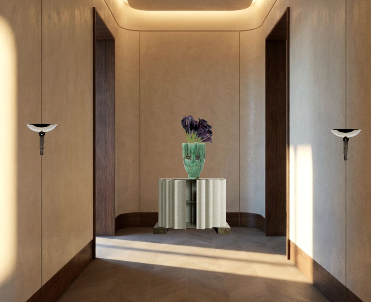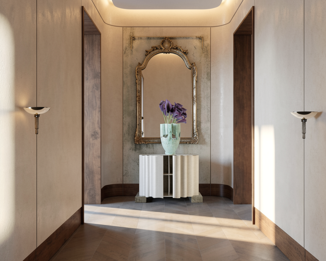 only change what i instruct you to change render the sconces to the correct perspective for where they are placed add a mirror wall behind the console the mirror should fit within the wall seams behind the console keep the materials of the console as is