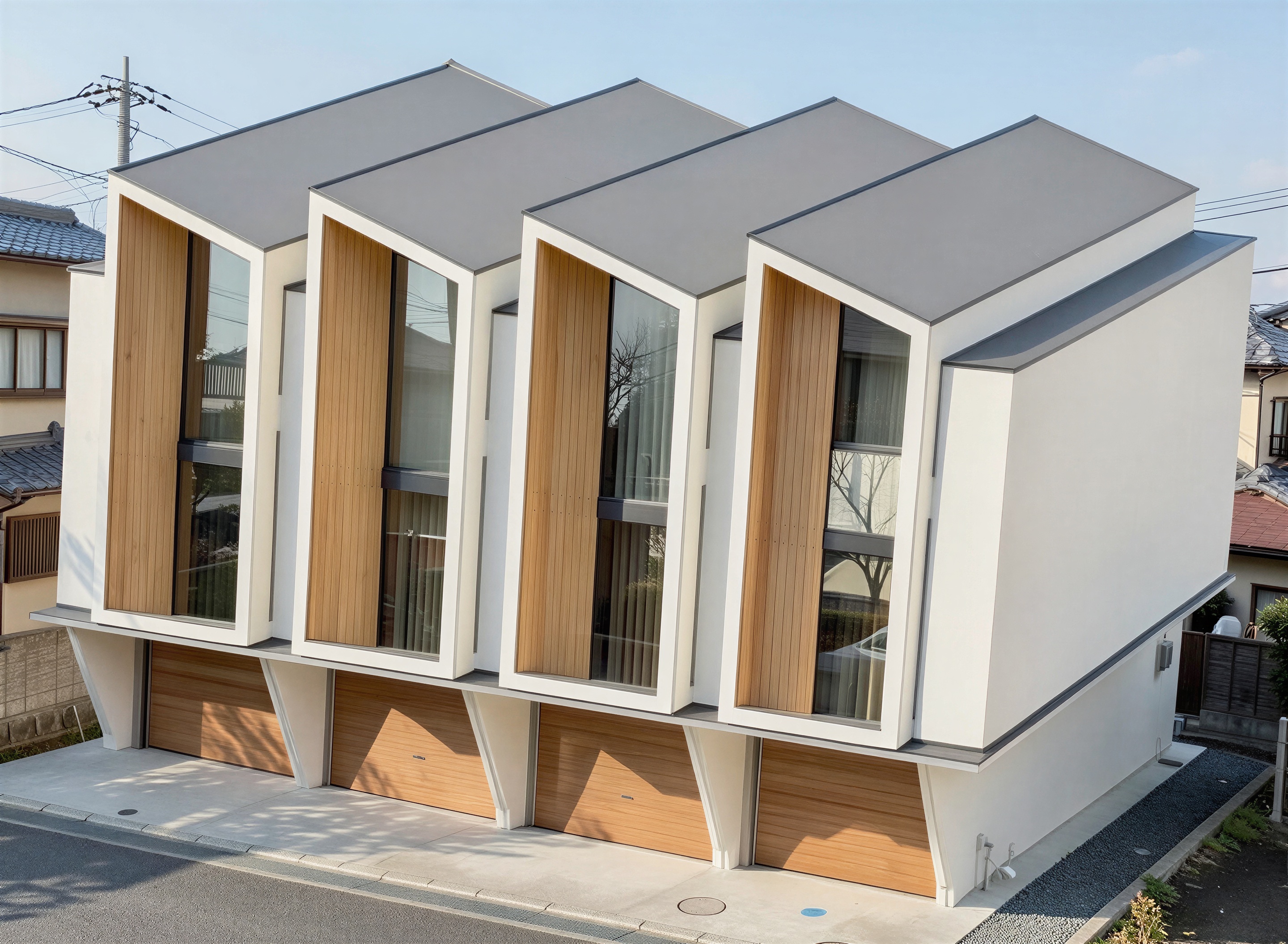 use the uploaded image strictly as a reference and absolutely preserve the building form layout and camera angle without any changes replace the roof material with a zinc panel finish adding clear shadow expression to enhance depth and realism add additional windows to the right side wall of the building integrated naturally into the existing facade do not modify any other elements
