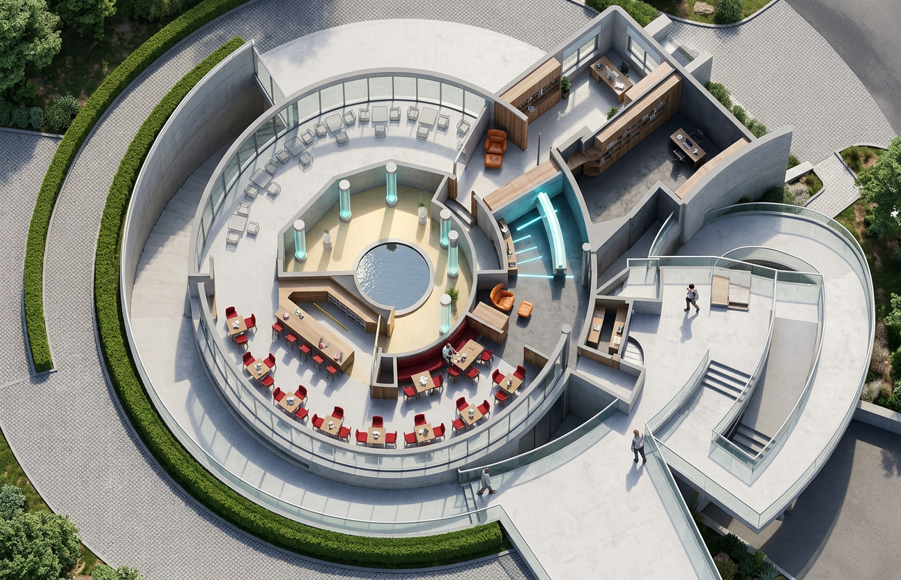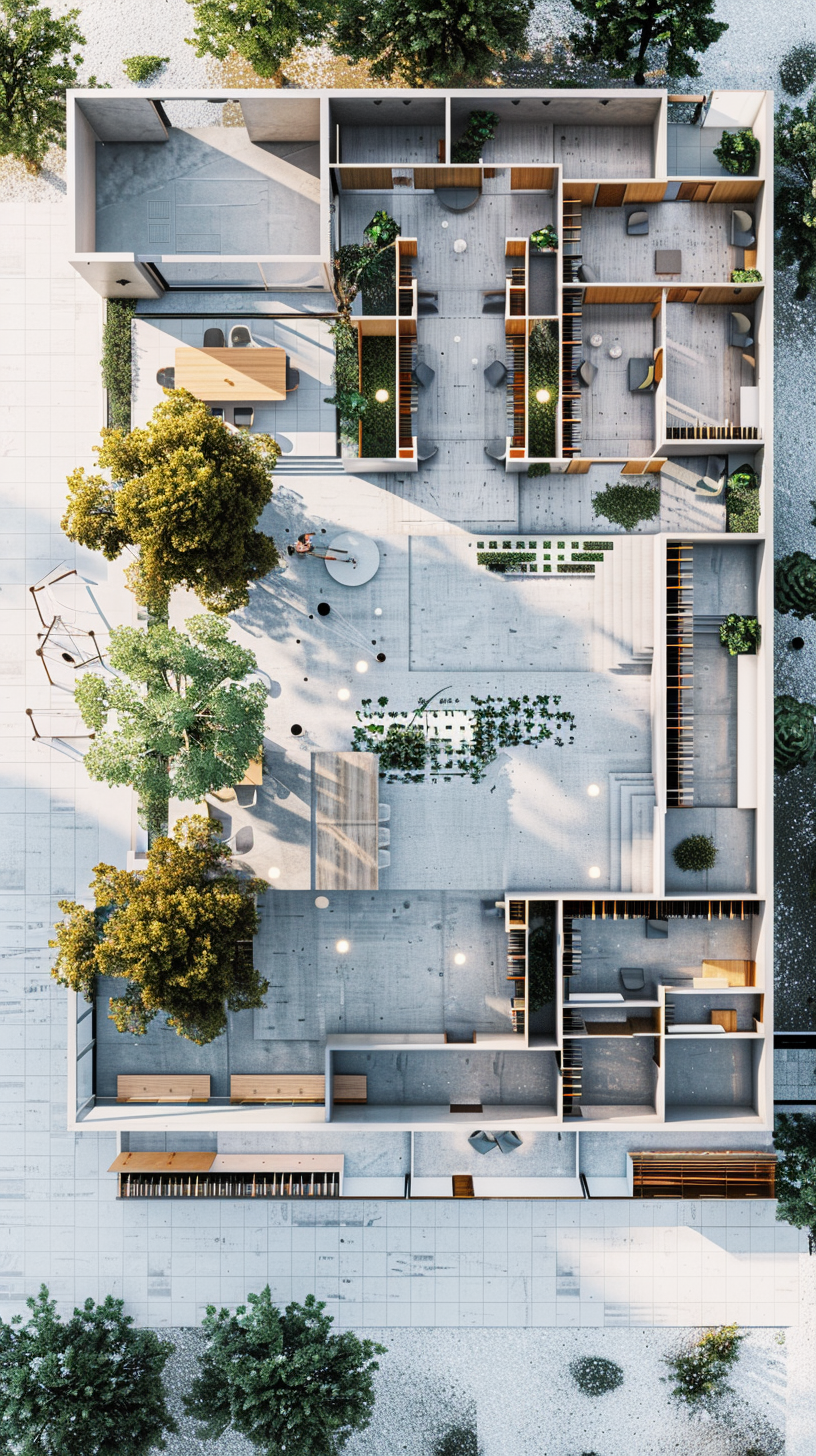 architectural axonometric cutaway 3d model of a modern dog shelter roof removed exposed exterior walls only open top structure clear spatial organization dog kennels systematically arranged veterinary room service areas office space indoor dog activity zone clean minimal concrete architecture diagrammatic yet photorealistic materials strong volumetric walls professional architectural visualization competition board style highly detailed 3d model