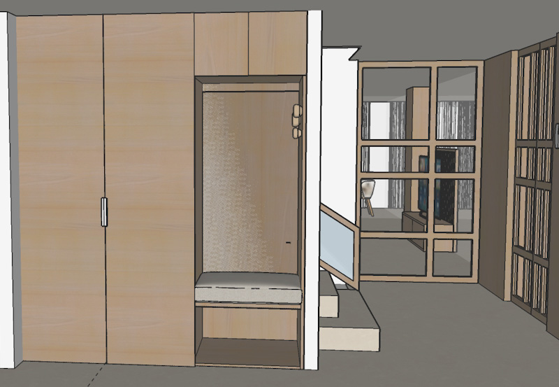 suelo de marmol beige mate sin vetas madera de nogal espejo en el hueco del armario
