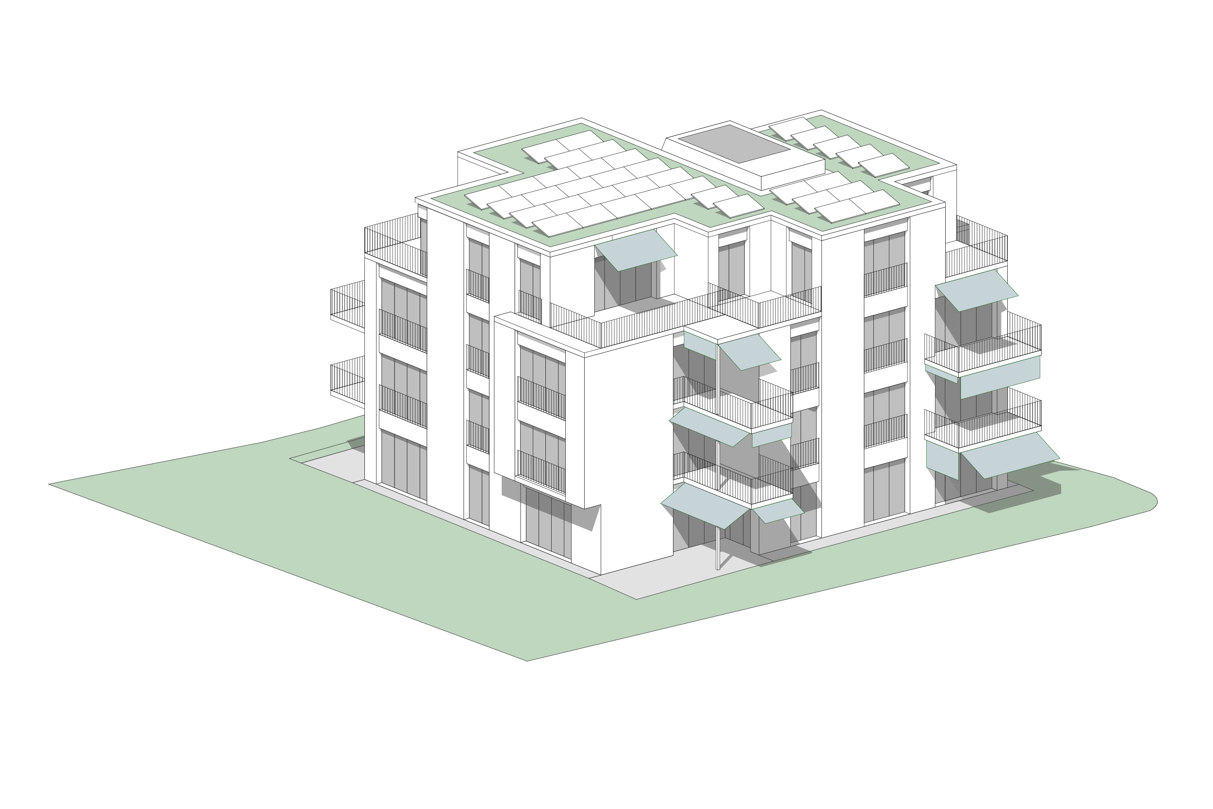 modern apartment buildings multiple stories are situated on a grassy hill the buildings have a contemporary design with a mix of muted green and light peach beige colors exterior walls are paneled with a muted teal green siding balconies and terraces are visible extending from various levels of the structures the buildings feature different levels of balconies and windows with simple rectangular shapes outdoor patio furniture is present on some of the terraces tall trees are positioned around and behind the buildings a grassy area with varying heights of grass surrounds the buildings the sky is a light blue with scattered puffy white clouds the lighting is soft and diffused suggesting an outdoor daytime setting the perspective is from ground level looking upward towards the buildings the composition is balanced with the buildings in the center and a background of trees the overall style is contemporary and visually appealing showcasing residential architecture with a focus on natural surroundings