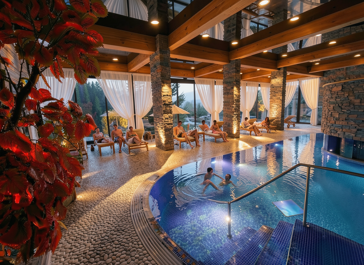 winter starry night behind windows nice surfaces and details light up interior and pool