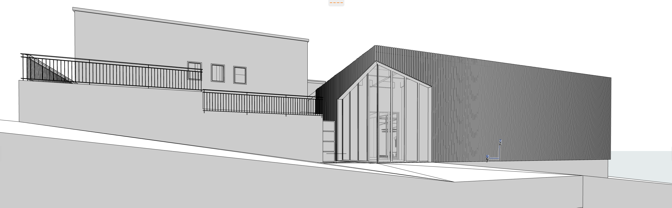 modernist interior shot rivestimento in listelli di legno verticali angolo vetrato trasparente muretto intonacato e pavimentazione in cemento industriale architecture